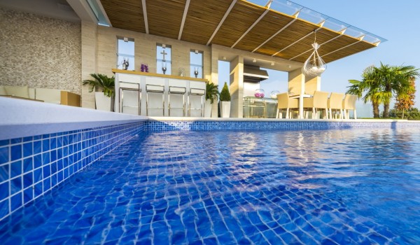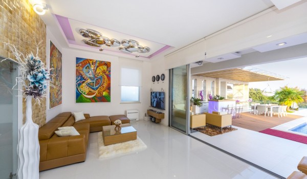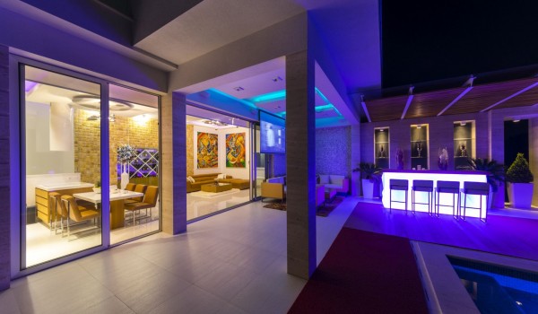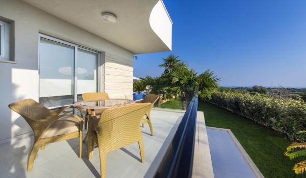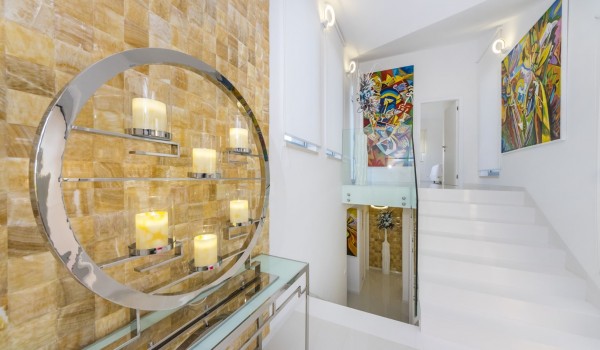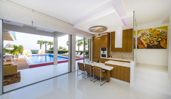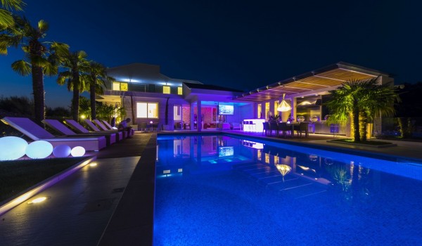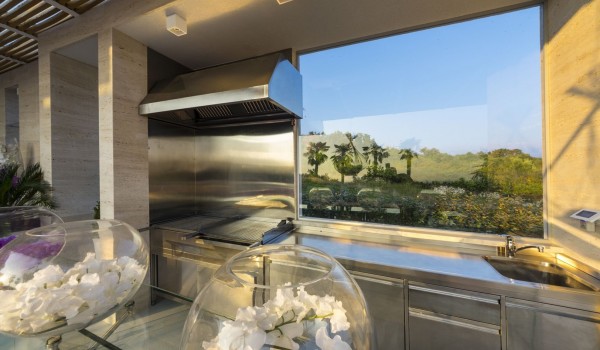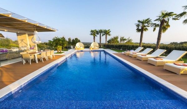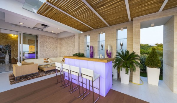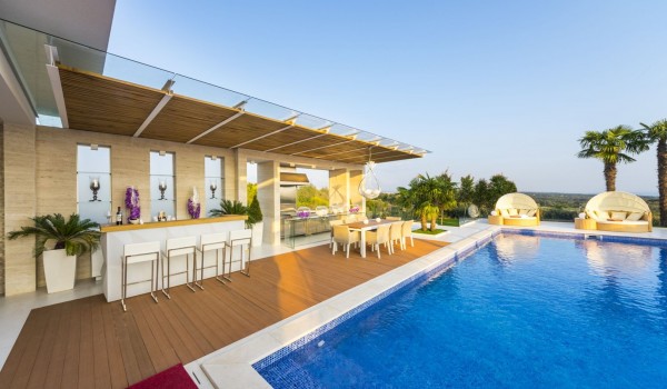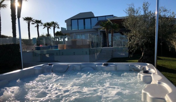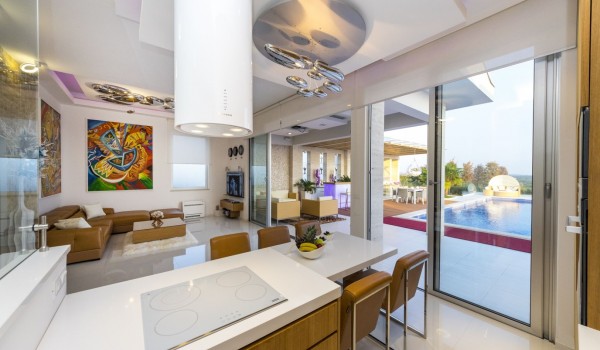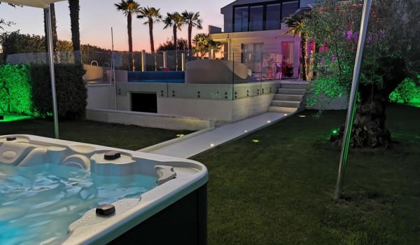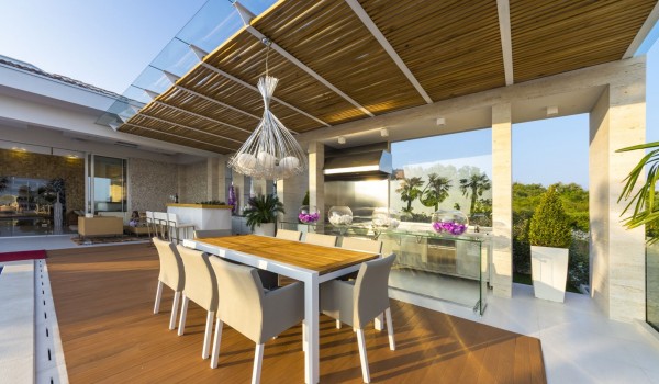 Auf der reich ausgestatteten Gartenterrasse, einem luxuriösen Juwel einer Luxusvilla, findet sich ein beheizter Privatpool mit den Maßen 12,5 x 5,5 m (62 m²), in dem Sie sich von der Sommerhitze erfrischen können. Für vollkommene Entspannung stehen den Gästen eine Reihe bequemer Sonnenliegen am Pool sowie überdachte, charmante Sonnenbetten mit hängenden Ballonsesseln neben dem privaten Whirlpool zur Verfügung. In einem überdachten Teil der Terrasse können in einer professionellen Küche mit elektrischem Grill verschiedene Köstlichkeiten zubereitet und an der Bar Cocktails oder Wein verkostet werden. Der Außenspeisebereich ist ein schöner Ort, um ein Abendessen bei Sonnenuntergang zu genießen. Das Besondere an diesem Raum ist die Möglichkeit, abendliche Cocktailpartys bei modernen LED-Lichtern in vollkommener Privatsphäre und Abgeschiedenheit zu organisieren. Mit ihrem umfangreichen Angebot ermöglicht Ihnen diese Schönheit einen unvergesslichen Urlaub und absoluten Spaß.
