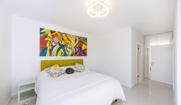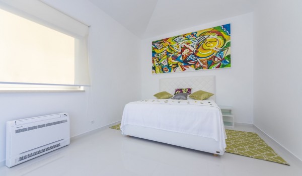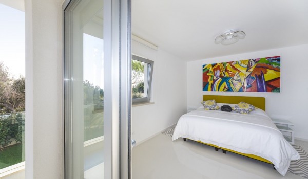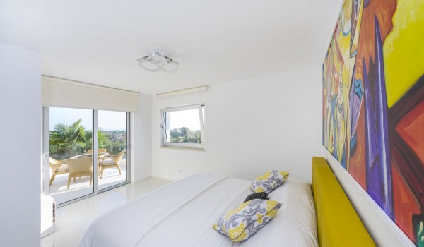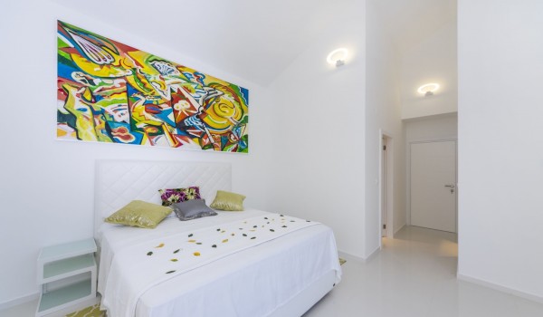 Wir steigen die Treppen zur zweiten Etage der Villa Hidden Hills Pag hinauf, die mit einem komfortablen, geräumigen Hauptschlafzimmer mit Kingsize-Bett und en-suite Badezimmer mit Dusche bereichert ist. Das Zimmer verfügt über eine private Terrasse mit Sitzgelegenheiten, die ideal zum Entspannen nach einem langen Tag mit romantischer Aussicht auf den Sternenhimmel ist. Ein begehbarer Kleiderschrank steht ebenfalls im Zimmer zur Verfügung.