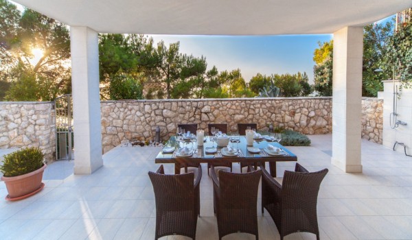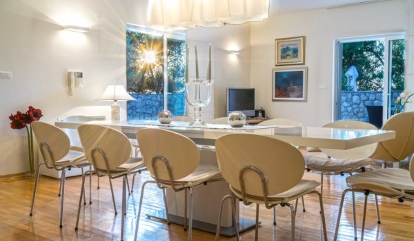 Der prächtig eingerichtete und dekorierte Ess-Wohnbereich mit einer modernen, voll ausgestatteten Küche hat Zugang zu einer wunderschönen Terrasse mit einem atemberaubenden Blick auf das kristallblaue Meer und die Inseln.