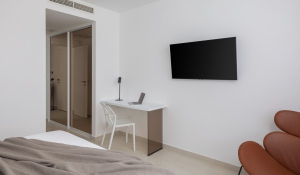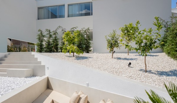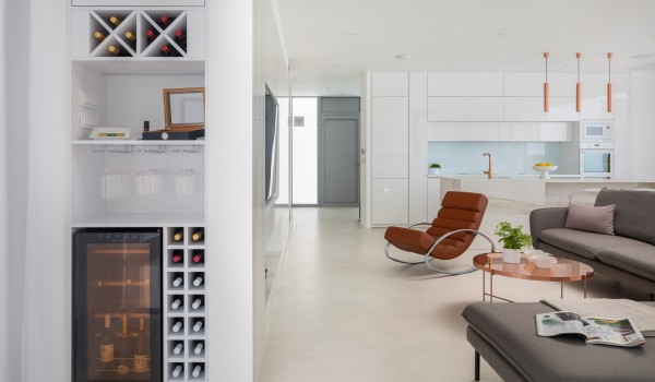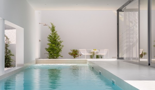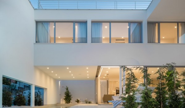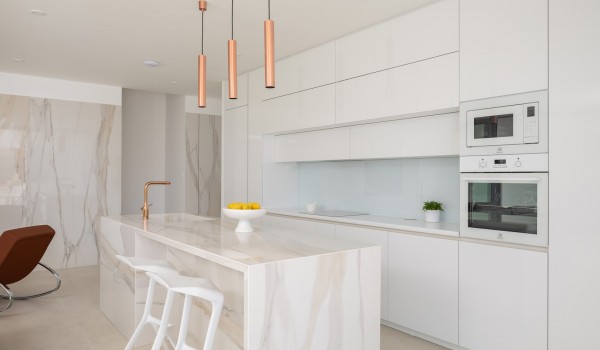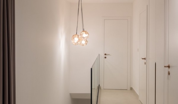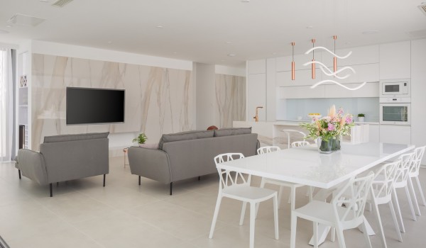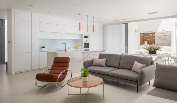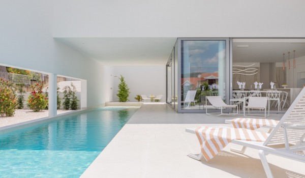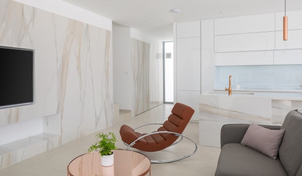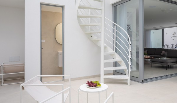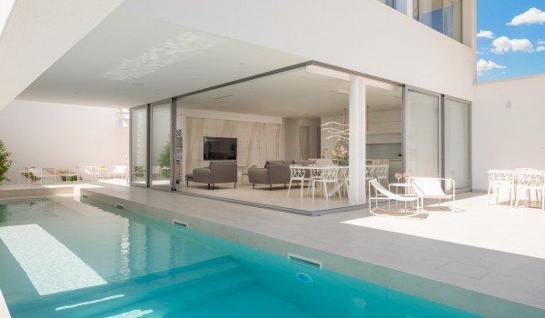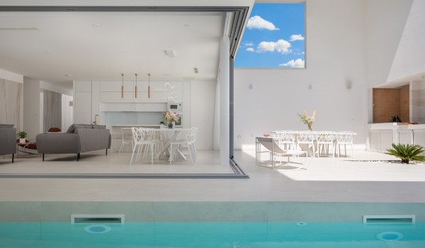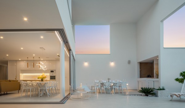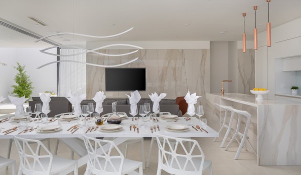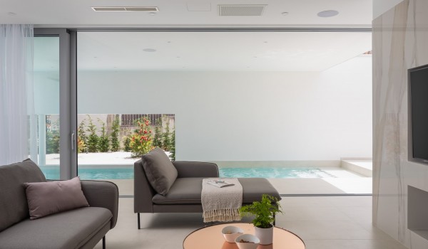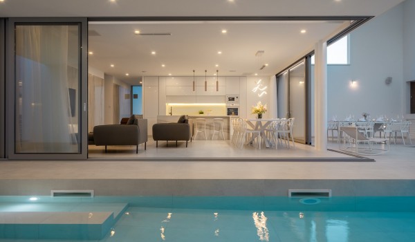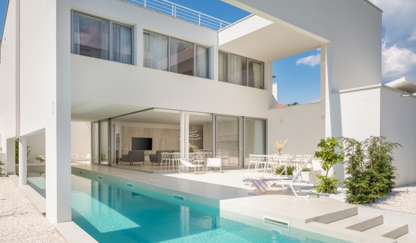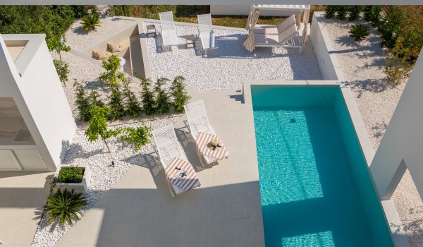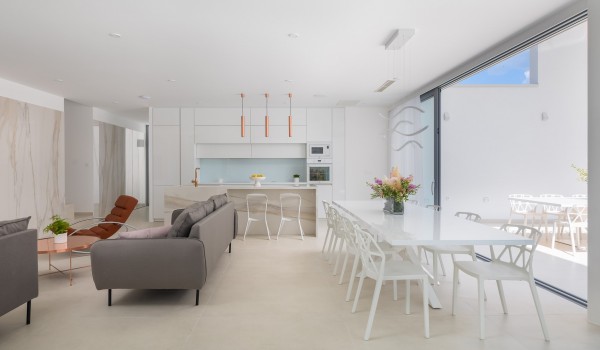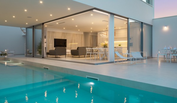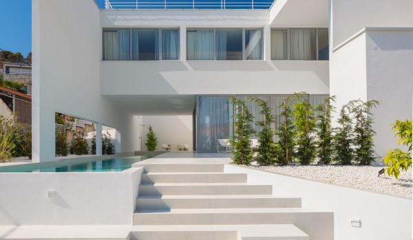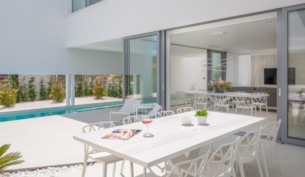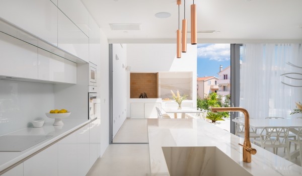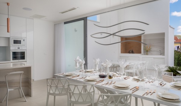 Das Erdgeschoss der Luxusvilla Angel mit beheiztem Pool und Whirlpool besteht aus einem geräumigen Wohnzimmer mit modernen und komfortablen Möbeln und einem Fernseher zum Entspannen und Genießen Ihrer Lieblingssendungen. Schiebewände ermöglichen den Eintritt von natürlichem Licht und seine Harmonie mit dem Innenraum sowie den direkten Ausgang vom Wohnzimmer in den Hof, wo sich der Pool befindet. In diesem Teil befindet sich eine moderne weiße Küche mit Kochinsel und Hochstühlen. Auf dieser Etage befindet sich auch eine Gästetoilette.