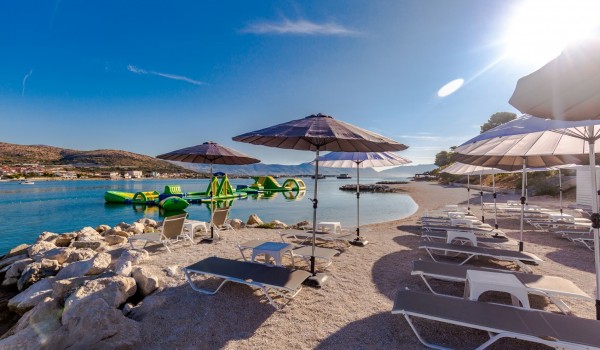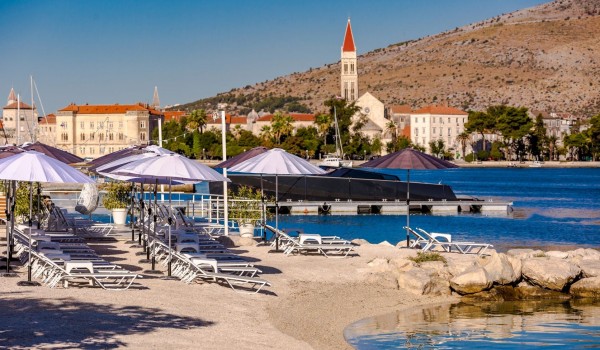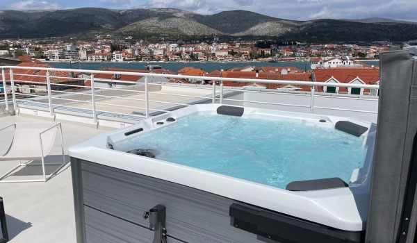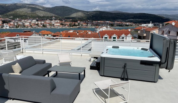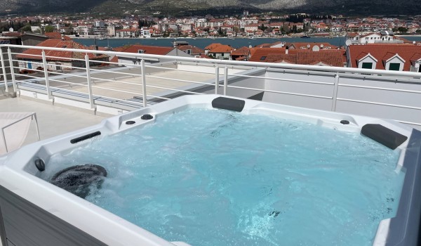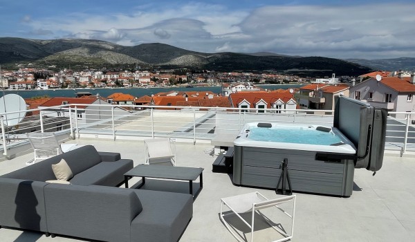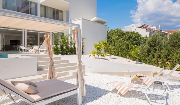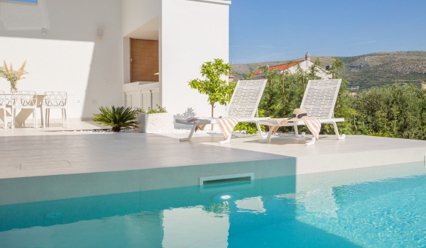 Die Luxusvilla Angel mit beheiztem Pool und Whirlpool ist eine neue und moderne Villa im Zentrum der historisch, kulturell und touristisch reichen Stadt Trogir. Es ist nur 300 m vom Kiesstrand entfernt (5 Gehminuten). Der Strand verfügt über eine Strandbar, Liegestühle und einen Aquapark für Kinder.