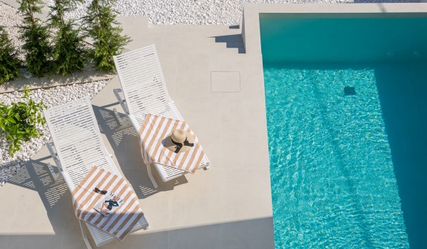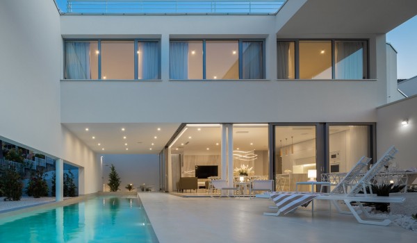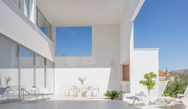 Der Innenhof dieser Ferienvilla ist im Detail dekoriert, ausgestattet mit bequemen Sitzgelegenheiten, Liegestühlen, Überdachung und Sonnenschirmen mit einem wunderschönen türkisfarbenen Pool von 70 m2, dessen Besonderheit darin besteht, dass er in drei Teile mit unterschiedlichen Tiefen und einer Überdeckung eines Teils unterteilt ist. Es besteht aus einem Teil, der Hydromassagepumpen zur vollständigen Entspannung enthält, einem Teil für Kinder und in der Verlängerung einem Schwimmteil von 9 m mit der üblichen Tiefe. Eine Außendusche sowie eine Toilette befinden sich am Pool. Im Innenhof gibt es einen überdachten Essbereich neben dem dalmatinischen Grill und einer Sommerküche mit Spüle, damit die Gäste unvergessliche Momente mit köstlichen traditionellen Gerichten dieser Gegend verbringen können.