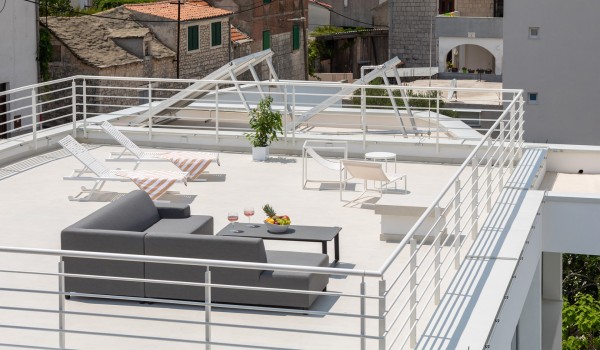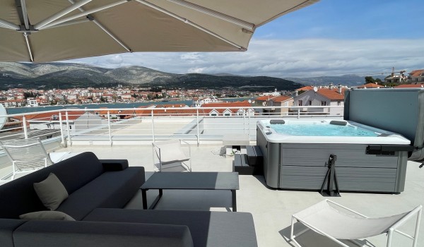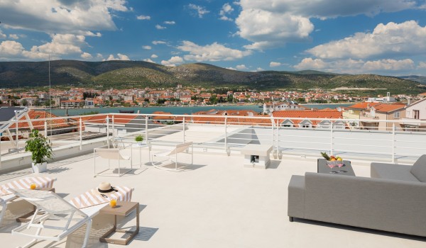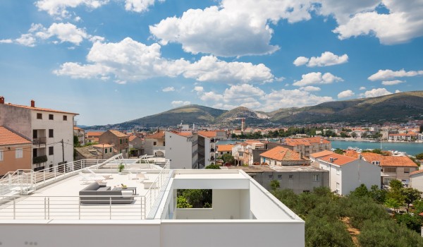 Ein großartiges Merkmal der zu vermietenden Villa ist eine geräumige Terrasse ganz oben in dieser haustierfreundlichen Villa, die über eine Außentreppe erreichbar ist. Die eingerichtete und eingezäunte Terrasse mit Sofa, Liegestühlen und Blick auf die Stadt Trogir und das Meer wird Sie sicherlich begeistern.