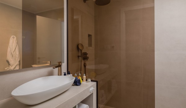 Im ersten Stock der Ferienwohnung, der über eine Innen- oder Außentreppe erreichbar ist, befinden sich 4 Schlafzimmer. Die drei Schlafzimmer sind mit Kingsize-Betten, eigenen Badezimmern mit Dusche, Kleiderschrank und TV ausgestattet. Das vierte Schlafzimmer hat ein Queensize-Bett, ein eigenes Badezimmer mit Dusche, ein Ankleidezimmer und einen Fernseher. Auf Wunsch des Gastes können 3 Zustellbetten für Kinder untergebracht werden. Auf dieser Etage befindet sich ein Waschraum mit allen notwendigen Einrichtungen.