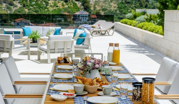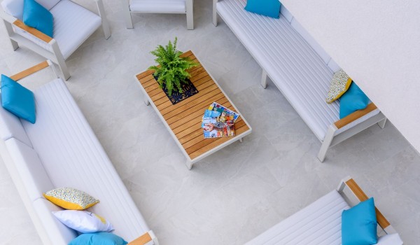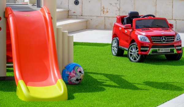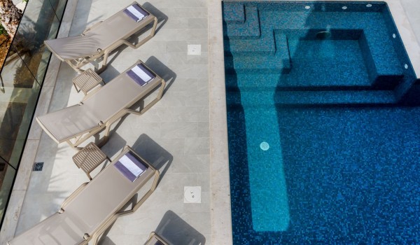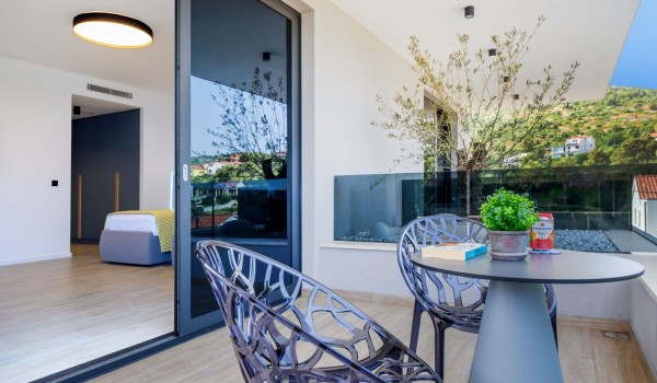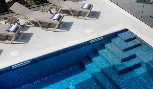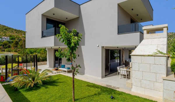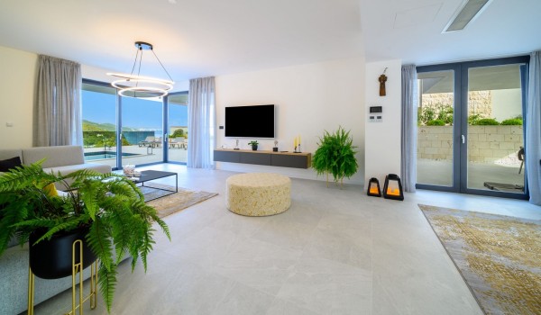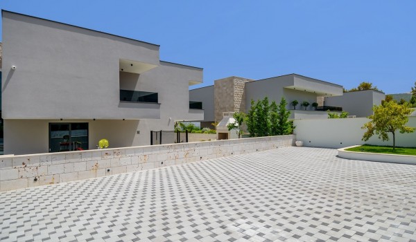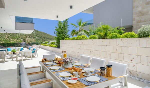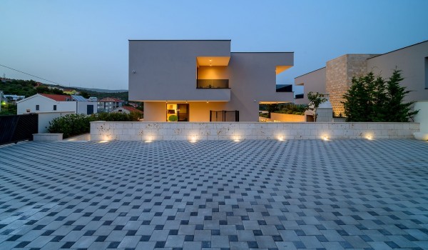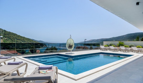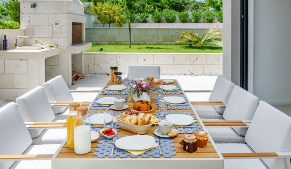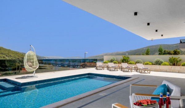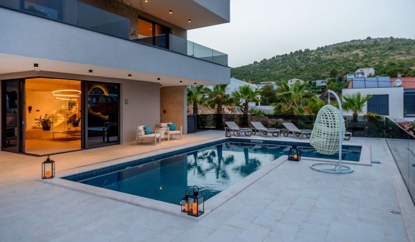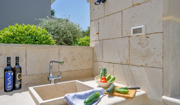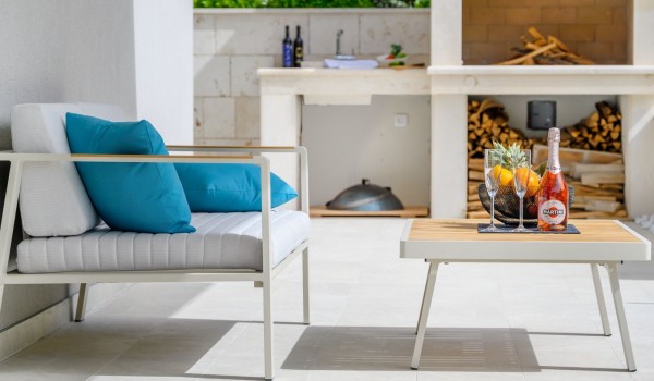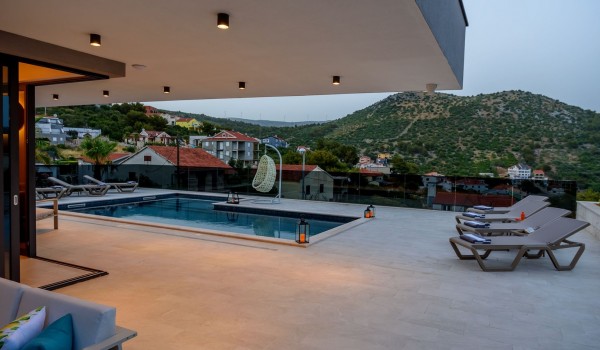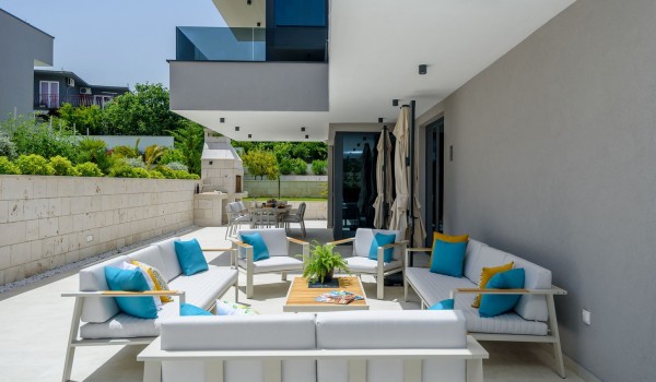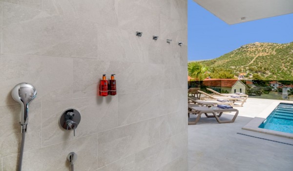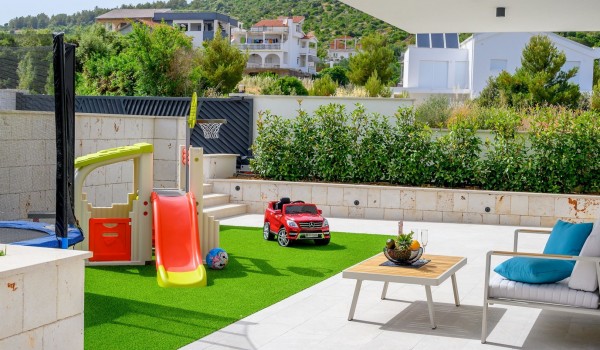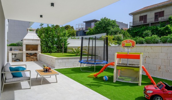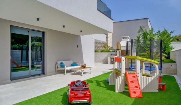 Die Außenterrasse dieser luxuriösen Privatvilla in Kroatien ist sorgfältig dekoriert und weißer Stein und mediterrane Pflanzen schaffen eine echte Oase, perfekt zum Genießen und Entspannen. Den Gästen steht ein Steingrill für die Zubereitung vieler dalmatinischer Spezialitäten und ein Esstisch im Freien für 8 Personen zur Verfügung. Neben dem Grill gibt es ein Waschbecken im Freien mit heißem Wasser. Der beheizte Pool (40 m²) ist von Liegestühlen umgeben und neben dem Pool befindet sich eine beheizte Außendusche. Eine Besonderheit dieser Terrasse ist die Fußbodenheizung im Bereich um den Pool, wo sich die Liegestühle befinden. Auf der Terrasse gibt es weitere bequeme Sessel, wo Sie lange Sommernachmittage verbringen, ein Lieblingsbuch lesen oder einfach nur die warme mediterrane Sonne genießen können. Für Gäste, die mit Kindern im Innenhof der kroatischen Luxus-Familienvilla Urlaub machen, gibt es auch einen ausgestatteten Kinderspielplatz.