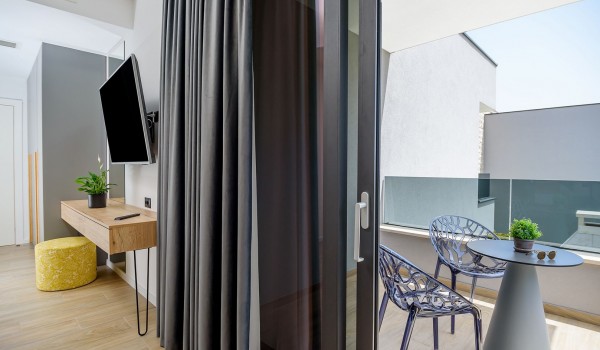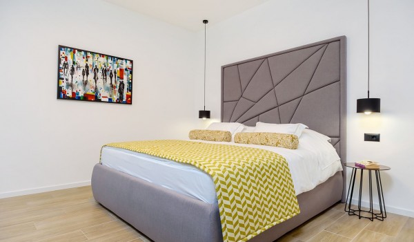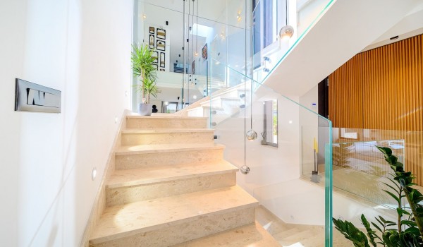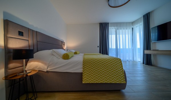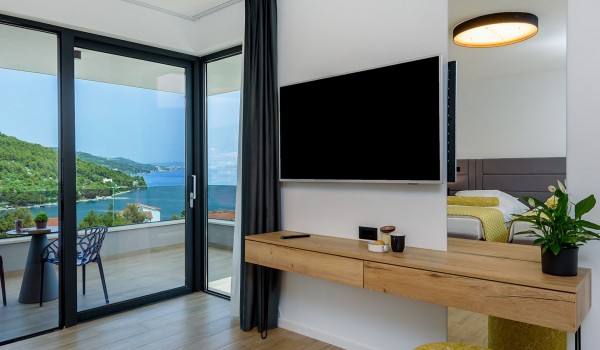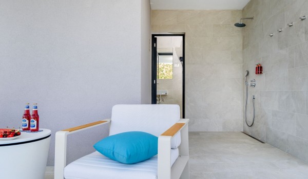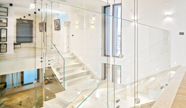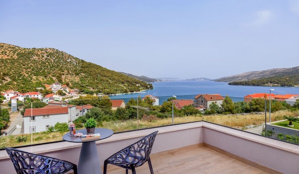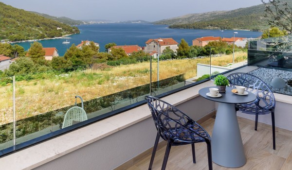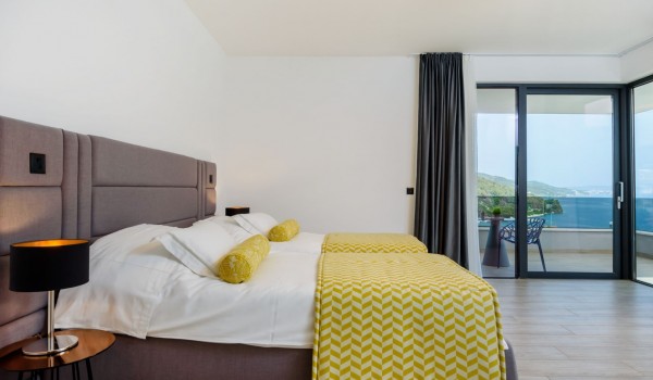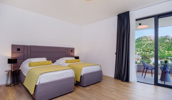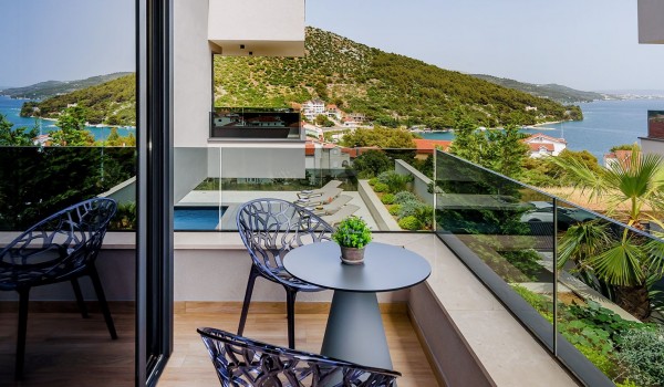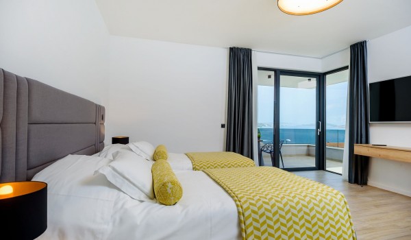 Treppen führen in den ersten Stock dieser kroatischen Luxus-Mietvilla mit Pool, wo 4 Schlafzimmer angeordnet sind. Zwei Zimmer haben Kingsize-Betten und ein eigenes Badezimmer mit Badewanne, und zwei haben zwei Einzelbetten, die zu einem Kingsize-Bett zusammengestellt oder in 2 Einzelbetten getrennt werden können, und ein eigenes Badezimmer mit Dusche. Jedes Zimmer hat einen eigenen Balkon mit Sitzecke und 3 Zimmer haben einen Blick auf die schöne Adria.