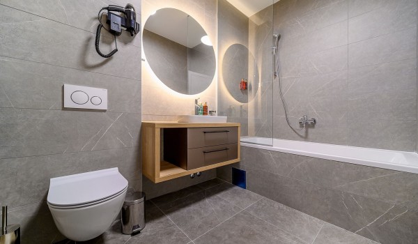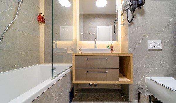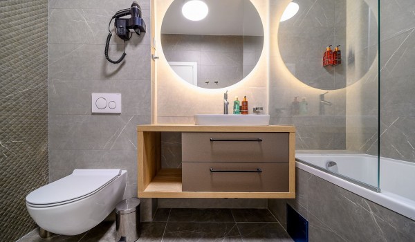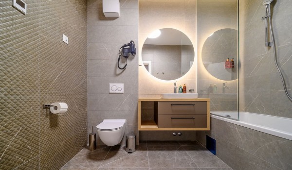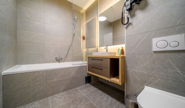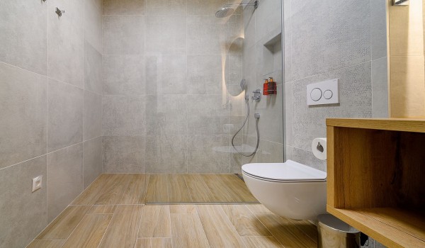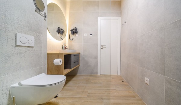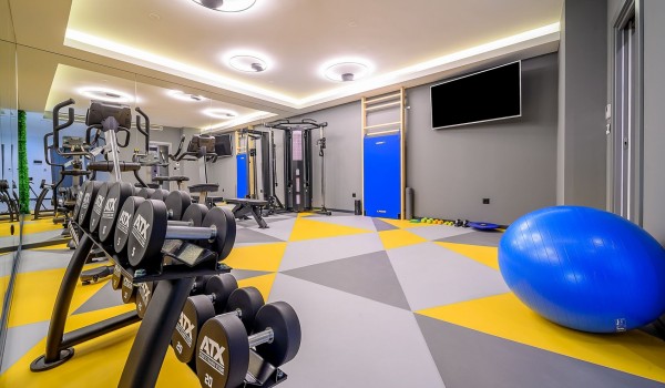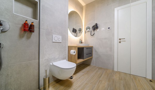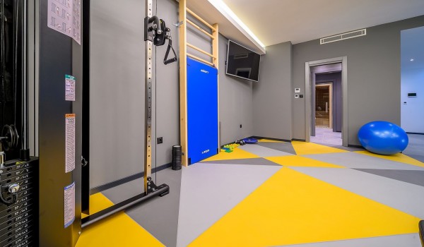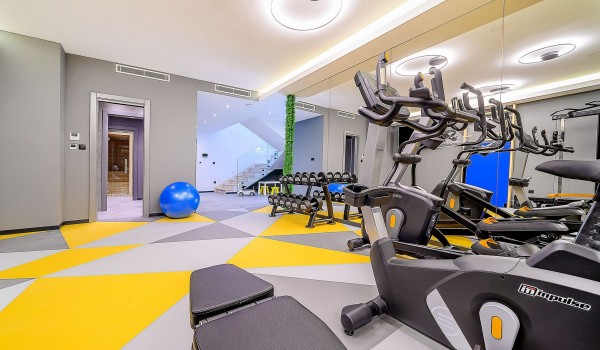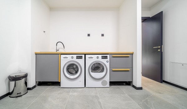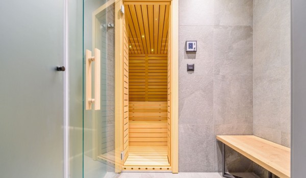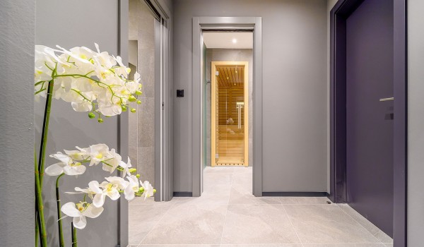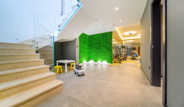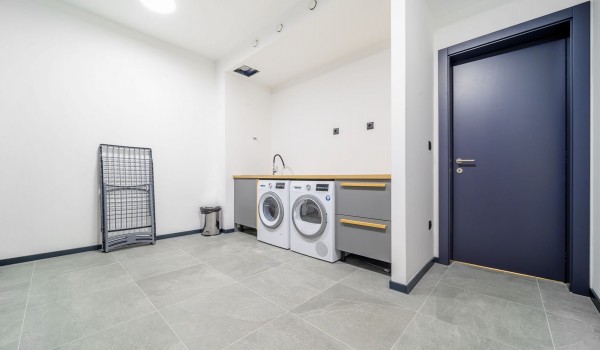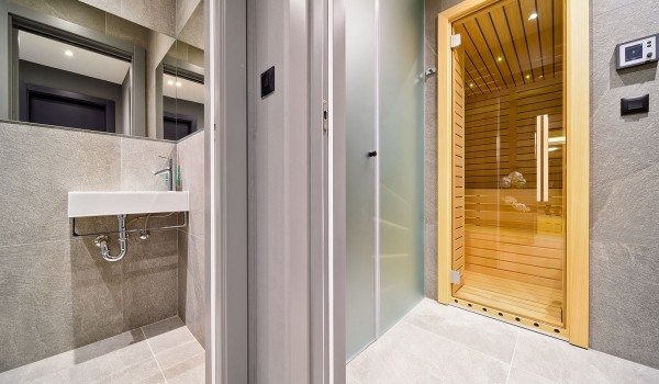 Im Untergeschoss der kroatischen Luxus-Familienvilla für den Urlaub gibt es ein ausgestattetes Fitnessstudio und eine Sauna zur Entspannung. Den Gästen dieser Etage stehen zwei zusätzliche Duschen zur Verfügung, eine neben der Sauna und eine neben dem Fitnessraum und der Toilette. Ein Teil dieser Etage wird auch von einer ausgestatteten Waschküche eingenommen.