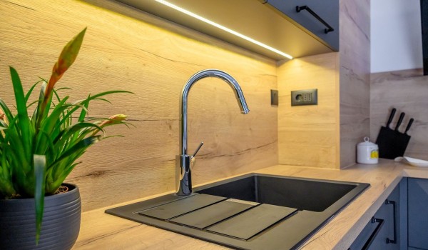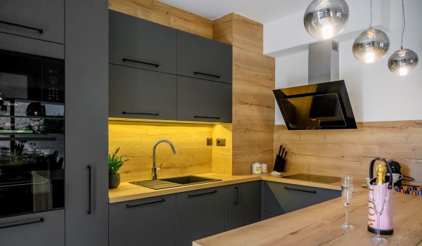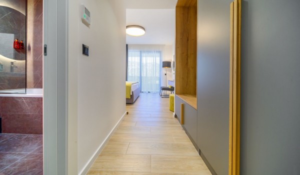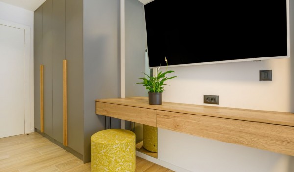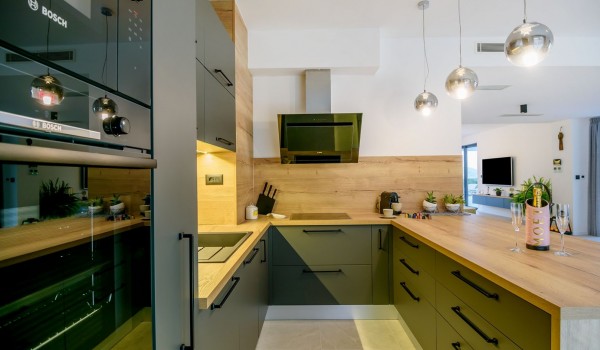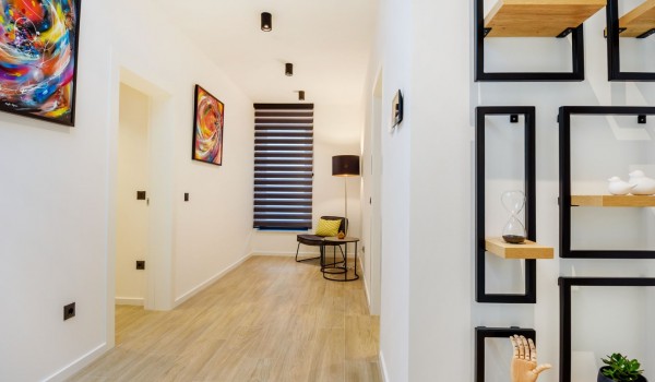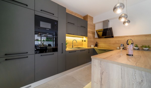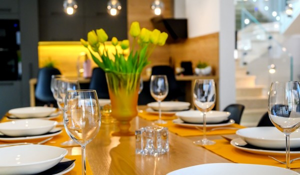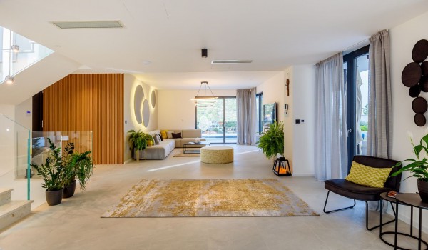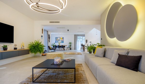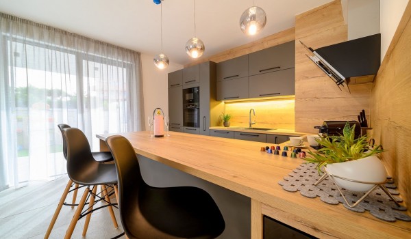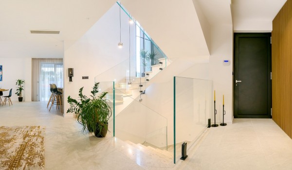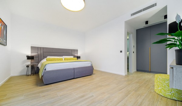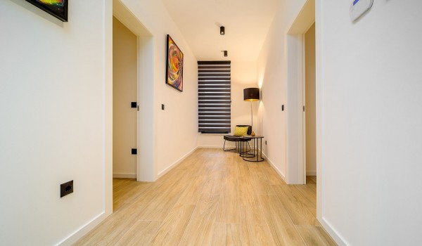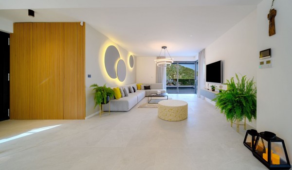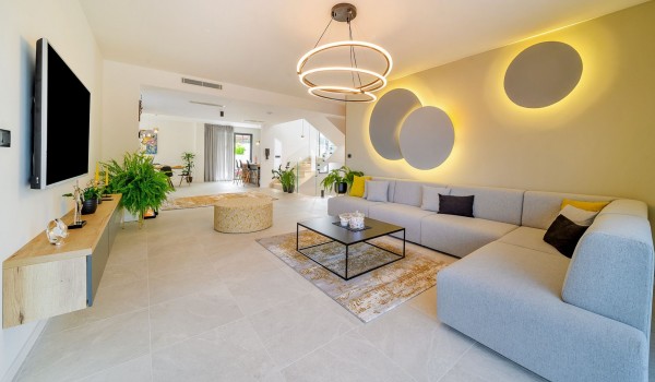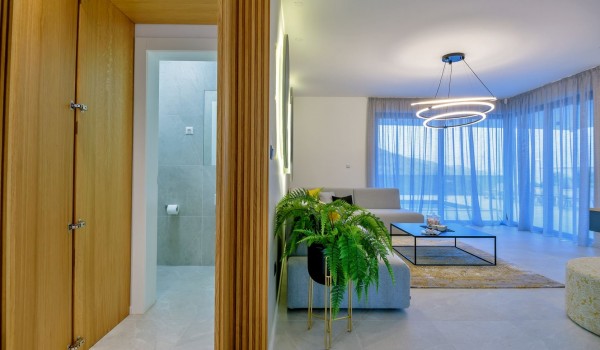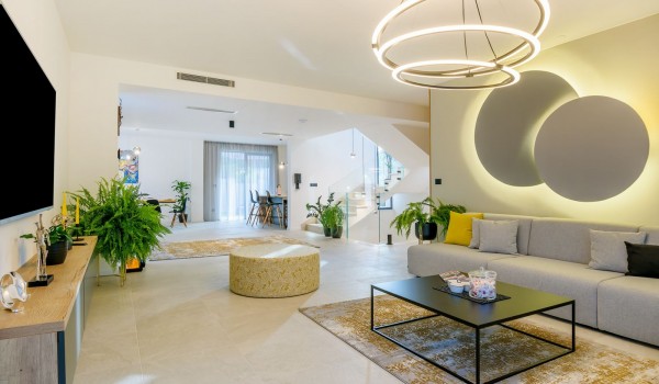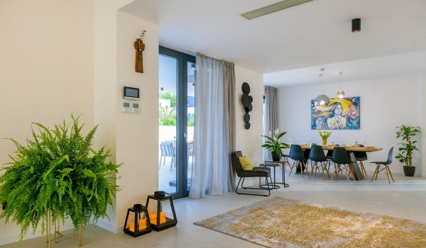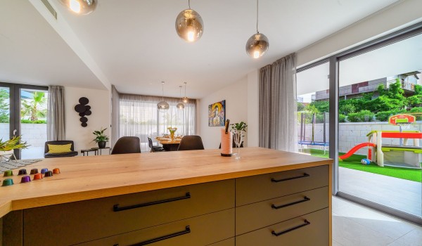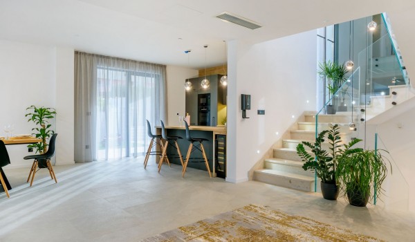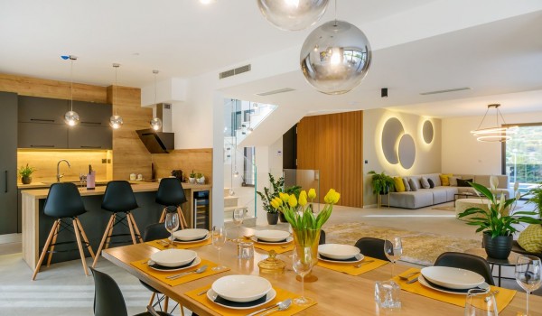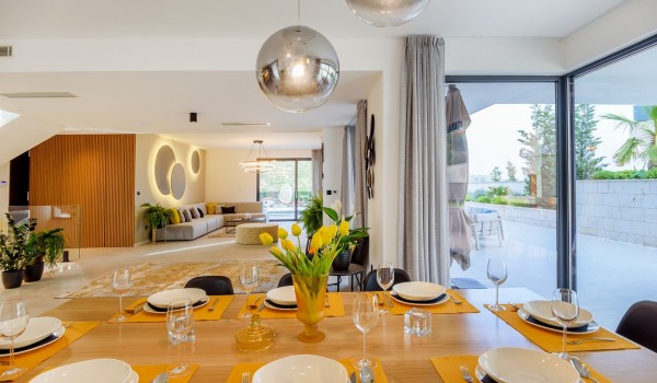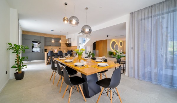 Von der Terrasse aus betreten Sie den offenen Raum im Erdgeschoss, wo sich ein geräumiges Wohnzimmer mit einem großen bequemen Sofa und einem LCD-TV sowie eine voll ausgestattete Küche und ein Esszimmer mit einem Esstisch für 8 Personen befinden. Dieser sorgfältig dekorierte, moderne Raum strahlt Wärme und Komfort aus. Auf dieser Etage befindet sich eine zusätzliche Toilette.