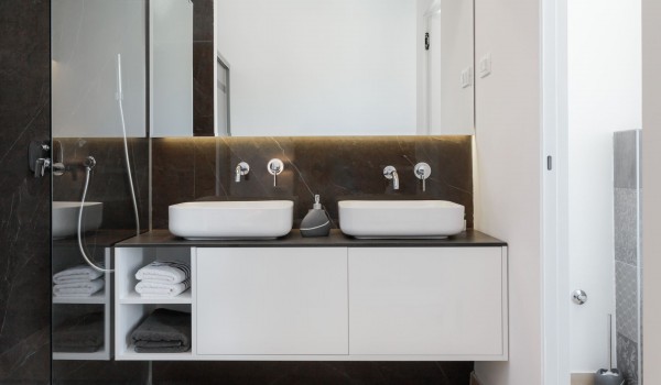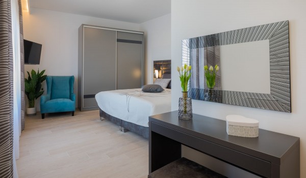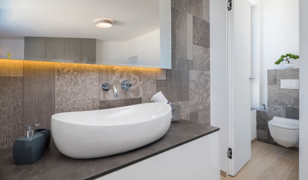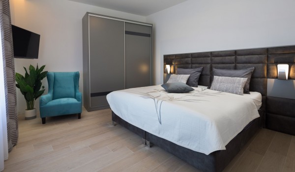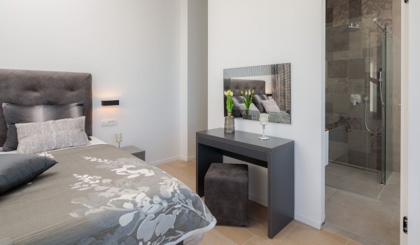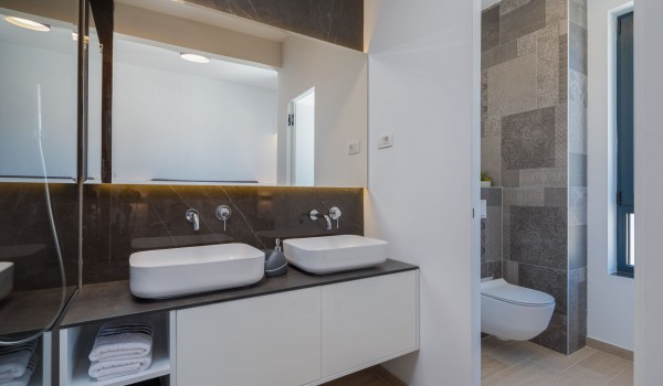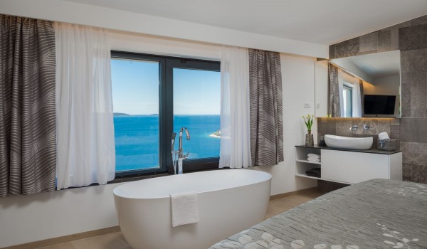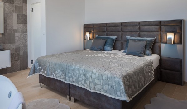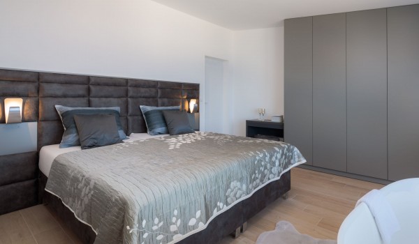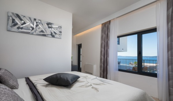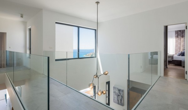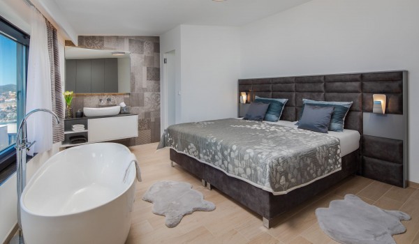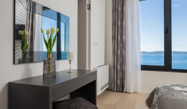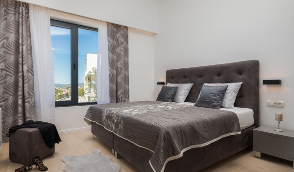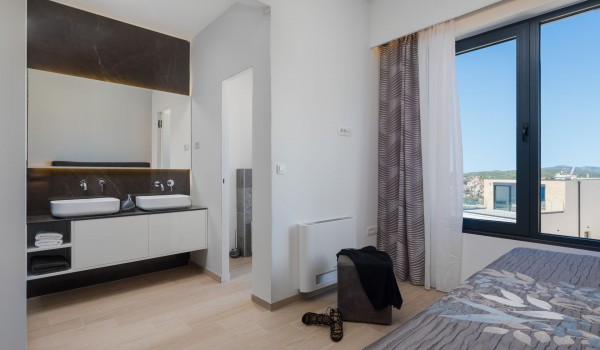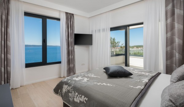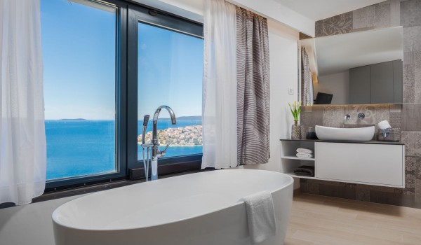 In die erste Etage der Luxusvilla Ciovo Tresor 2 gelangen wir vom Wohnzimmer aus über die Treppe. Drei komfortable Zimmer, jedes mit einem Kingsize-Bett und eigenem Bad, sind sorgfältig platziert und bieten maximale Privatsphäre und Ruhe, wenn Sie sich vom Trubel zurückziehen möchten. Das Hauptschlafzimmer ist mit einer Badewanne ausgestattet, von der aus Sie auch den atemberaubenden, weiten Blick auf das Meer genießen können. Dank der Glaswände und des gekonnten Designs sorgt die 300 m² große Luxusvilla Ciovo Tresor 2 für ausreichend Sonnenschein und versetzt Sie in die Umarmung des Meeres und der Inseln Brac und Solta. Die unmittelbare Nähe zu wunderschönen Kiesstränden und kristallklarem Meer machen diesen Ort ideal für einen perfekten Urlaub.