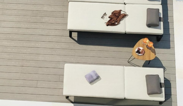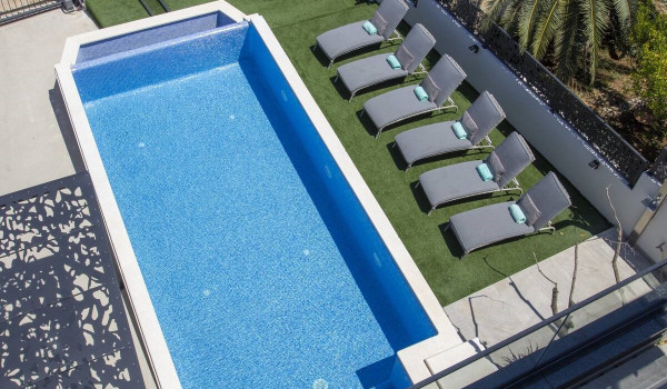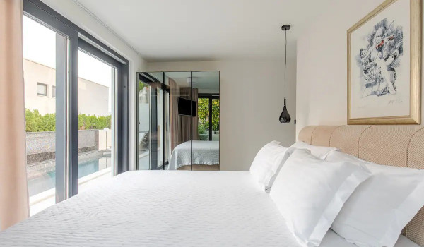 Der Zugang zum zweiten und dritten Stock der Villa befindet sich auf der rechten Seite des Hauses, vom Parkplatz (3 Plätze) aus. Ein paar Stufen führen zum 21m² beheizten Außenpool und zur Tür, die zu den Treppen in den zweiten Stock führt, wo sich 4 klimatisierte Schlafzimmer mit en-suite Badezimmern, Kingsize-Betten, Balkonen, Fernsehern, Fußbodenheizung und WLAN-Internet befinden.