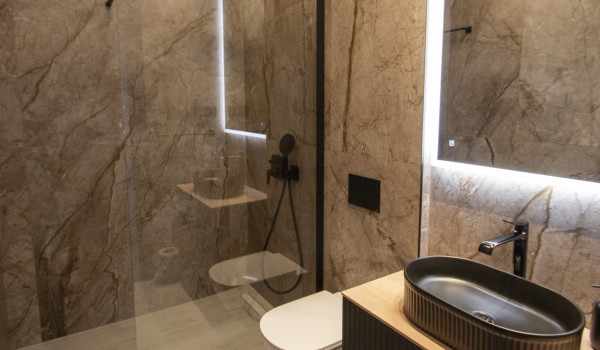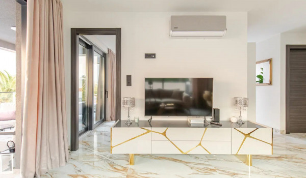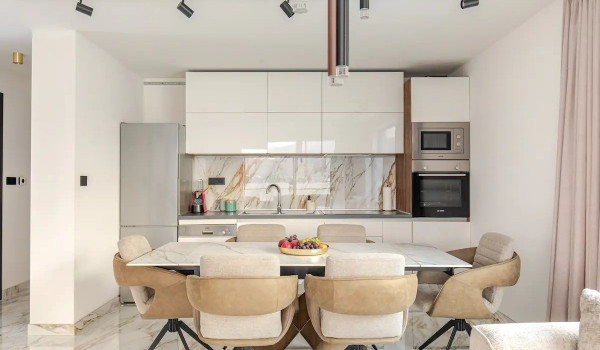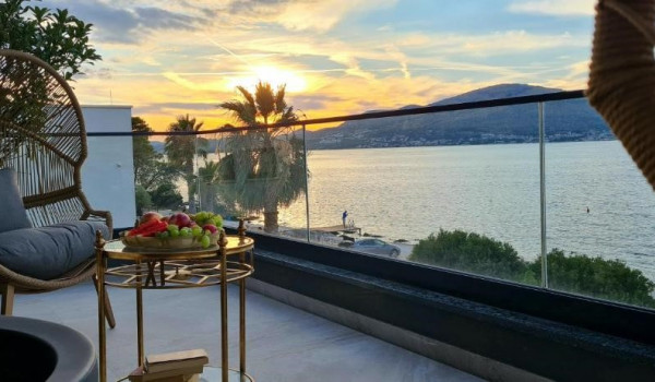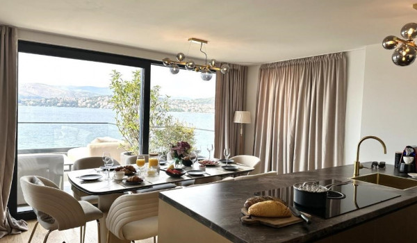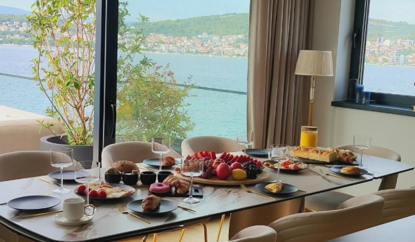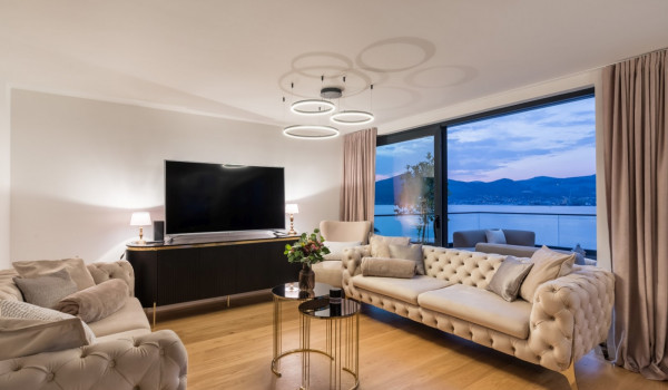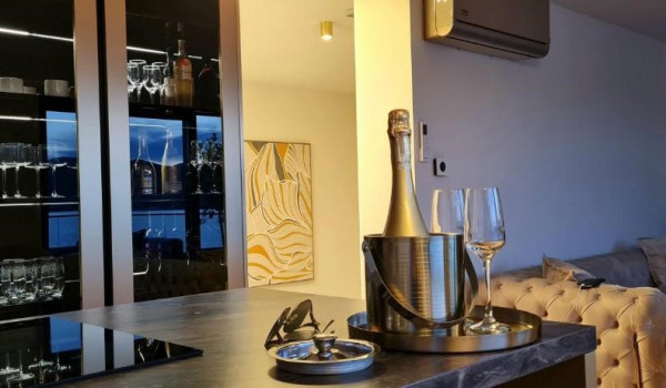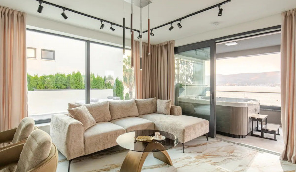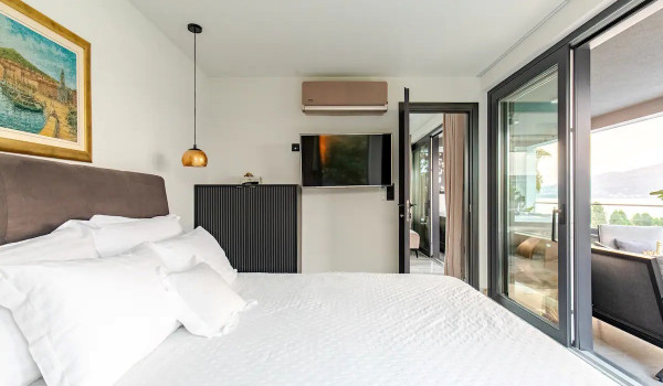 Die Küche ist mit allen notwendigen Besteck- und Kochutensilien ausgestattet, und in der Bar der Küche finden Sie Gläser für alle Arten von Getränken und Cocktails, damit Sie sich bei einem Glas Wein oder einem erfrischenden Cocktail entspannen können. Diese Etage verfügt auch über einen Esstisch für 6 bis 12 Personen sowie ein geräumiges klimatisiertes Wohnzimmer mit Fußbodenheizung, komfortablen Sofas und einem SMART LCD-TV. Vom Wohnzimmer aus öffnen sich Glaswände zu einer wunderschönen Südterrasse mit Meerblick, ausgestattet mit komfortablen Sofas für den Außenbereich.