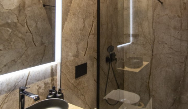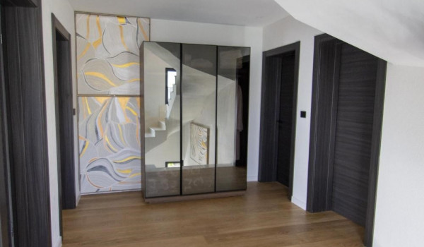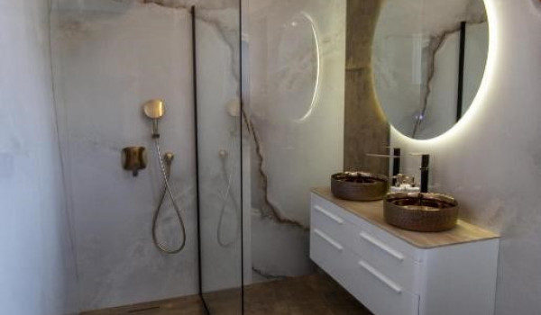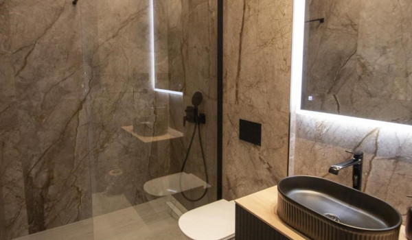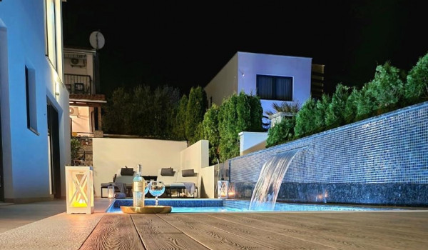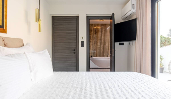 Auf der linken Seite betritt man die Villa, um Zugang zum Erdgeschoss und zum ersten Stock zu erhalten. Im Erdgeschoss können Sie Ihr Fahrzeug auf dem privaten Parkplatz der Villa (für 2 Fahrzeuge) abstellen. Direkt daneben befindet sich der beheizte Außenpool mit sechs Sonnenliegen. Das Erdgeschoss der Villa bietet auch eine voll ausgestattete Innen-Sommerküche, ein Esszimmer und einen privaten Weinkeller, der mit der Sommerküche verbunden ist. Neben der Küche befindet sich ein Badezimmer mit Dusche. Vom Essbereich führen Treppen hinter das Haus zum Eingang des ersten Stocks, wo sich der Esstisch und das Wohnzimmer befinden. Eine Glastür führt vom Wohnzimmer auf die Terrasse mit Jacuzzi. Neben dem Wohnzimmer befindet sich eines der drei Doppelzimmer, das Zugang zur Terrasse mit Jacuzzi hat. Ein privates Badezimmer mit Dusche befindet sich auf der anderen Seite des Wohnzimmers, neben der Küche. Auf derselben Etage befinden sich die weiteren Doppelzimmer mit Kingsize-Betten, Fußbodenheizung und en-suite Badezimmern, eines davon mit Jacuzzi. Die Villa verfügt auch über eine Sauna und ein türkisches Bad. Jedes Zimmer ist mit einem LCD-SMART-TV ausgestattet und bietet High-Speed-Internet. Außerdem hat jedes Zimmer eine eigene Terrasse, und die Terrassen auf der Süd- und Westseite bieten einen atemberaubenden Meerblick.