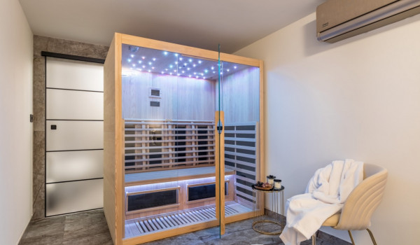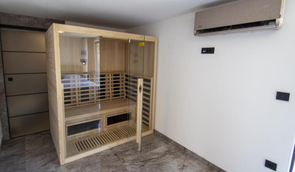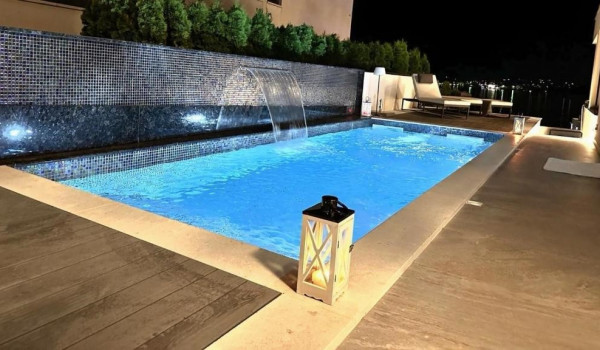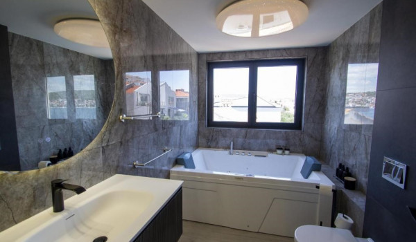 Die Luxusvilla Destiny Ciovo am Meer mit Pool und Sauna verfügt über insgesamt vier Etagen: Erdgeschoss, erste, zweite und dritte Etage. Im Erdgeschoss befinden sich Parkplätze für zwei Autos und ein großer beheizter Infinity-Pool von 44m². Im Erdgeschoss gibt es auch eine voll ausgestattete Sommerküche mit Verbindung zu einem Weinkeller, einen Essbereich und ein Wohnzimmer mit Terrasse und Jacuzzi. Auf dieser Etage befindet sich auch ein Badezimmer mit Dusche und Sauna.