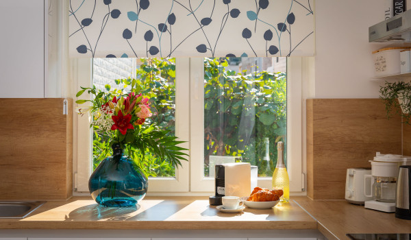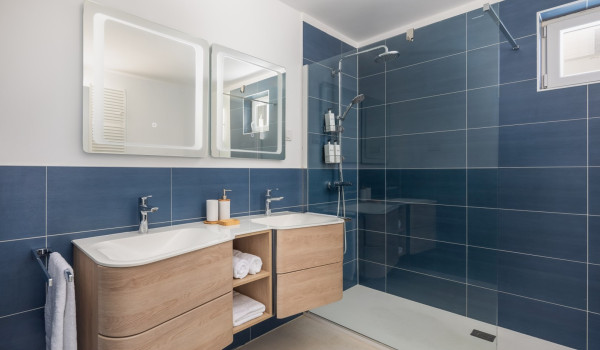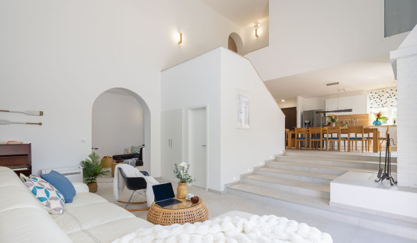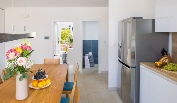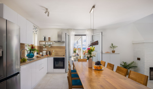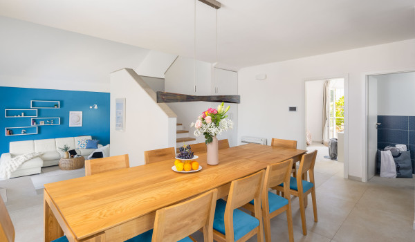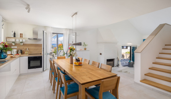 Stairs in the center of the living room lead to the dining area, equipped with a dining table and a fully equipped kitchen. The kitchen includes a stove, refrigerator, oven, microwave, toaster, dishwasher, cutlery, kettle, coffee maker, and a dining table for 10 people. A staircase behind the dining table leads to the first floor, where the remaining three bedrooms are located. If you're not in the mood to cook, you can always hire our professional chef to prepare delicious meals just for you.