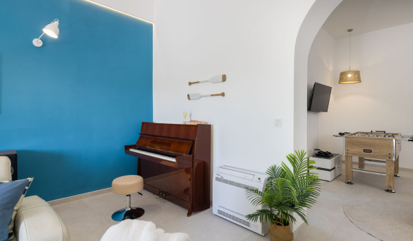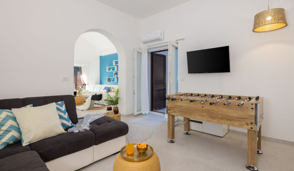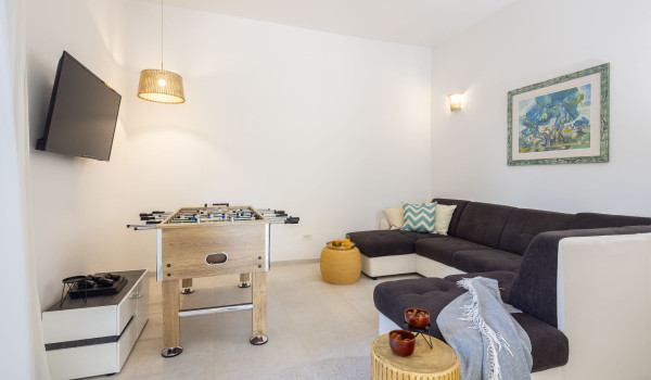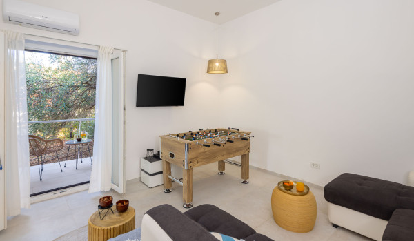 Upon arrival at the private parking lot, you will find garage parking, and the villa can be accessed via stairs on the right side of the building, leading to the main entrance. The main entrance takes you to the living area with a living room, sofa, TV, an indoor fireplace, storage space, and one of the bedrooms located on the ground floor, next to the playroom, which includes a foosball table, TV, Sony PlayStation, and a sofa. The fully air-conditioned bedroom features a queen-size bed, TV, work desk, a balcony with outdoor seating, an en-suite bathroom with a shower, towels, a hairdryer, and heating. The bedroom’s balcony overlooks the garden. Glass doors from the living room lead to the sunny outdoor terrace with a pool, seating area, and sun loungers. Another part of the terrace, featuring a barbecue and outdoor seating, is also accessible from the kitchen.