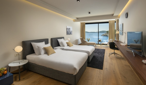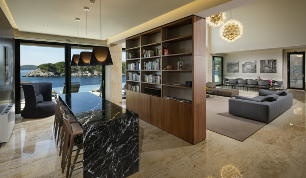 The luxury Dubrovnik villa with a heated pool by the sea and a sauna is set on a 1,200 m² property, with 700 m² of living space spread across three levels: ground floor, first floor, and second floor. The villa features five bedrooms in the each with its own en suite bathroom.