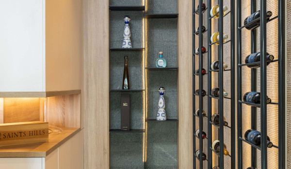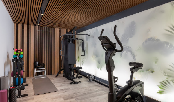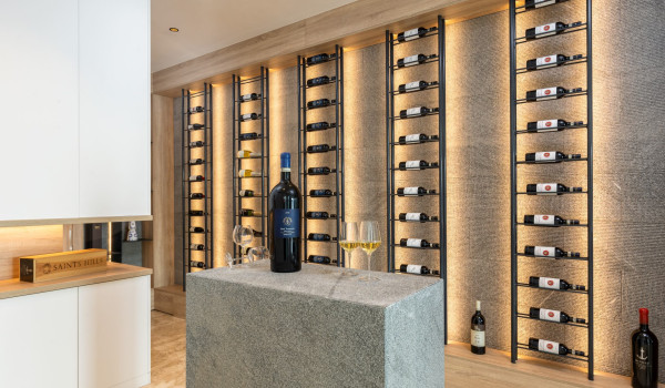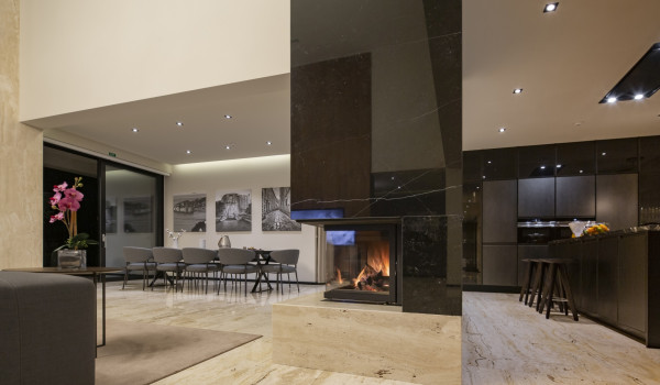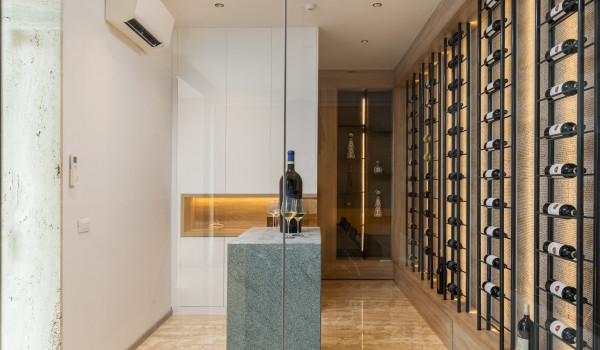 From the terrace, guests enter the open-plan ground floor, which features a spacious living area, a dining section with a table for 8 guests, a fully equipped kitchen set discreetly in the background, as well as a private library and bar—ideal for relaxed evenings. Two Minotti sofas dominate the living space, where a striking Flos chandelier takes centre stage, while the kitchen is fitted with state-of-the-art Siemens appliances.