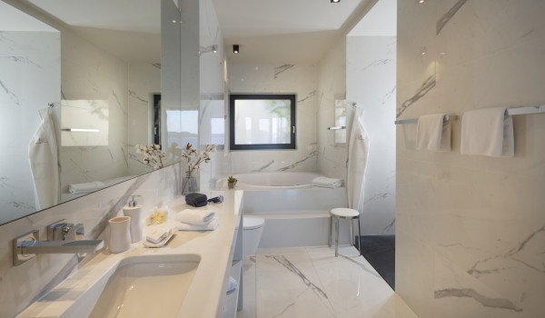 Guests can reach the first floor via stairs or elevator, where two elegantly appointed bedrooms are located. One bedroom features a queen-size bed, TV, and a comfortable seating area, along with an en suite bathroom with a bathtub clad in white Carrara marble. The second bedroom offers twin beds, a TV, a seating area, and an en suite bathroom with a shower.