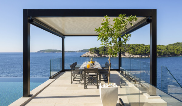 On the terrace of the luxury holiday and rental villa Dubrovnik Amelie, a large heated swimming pool awaits, perfectly suited for a refreshing start to the day while seamlessly blending into the spectacular sea horizon. To the right, there is an elegant gazebo with a large dining table for 10 guests, connected by steps to a sun deck located directly on the beach.
