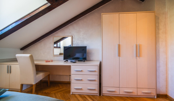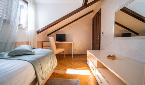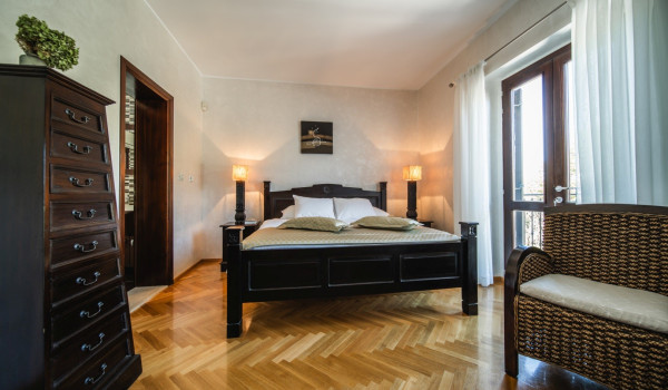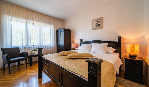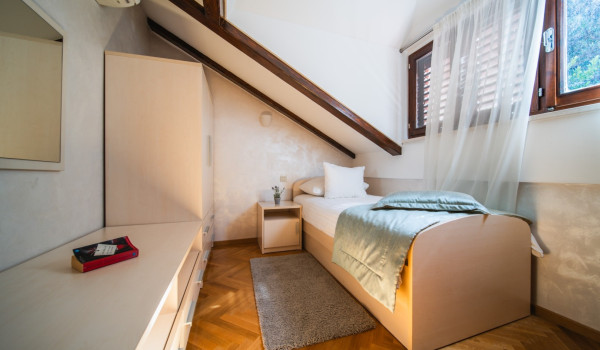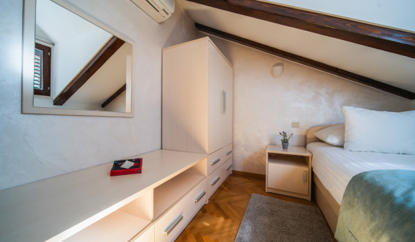On the second floor of this fully fenced Croatian luxury vacation rental villa, there is one single bedroom and two double rooms with a shared bathroom with a shower. One of the bedrooms has its own terrace. In addition to an extremely pleasant and, above all, luxurious interior, within the grounds of the modern pet-friendly villa with a sea view, we find many interesting and special features.