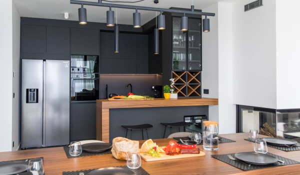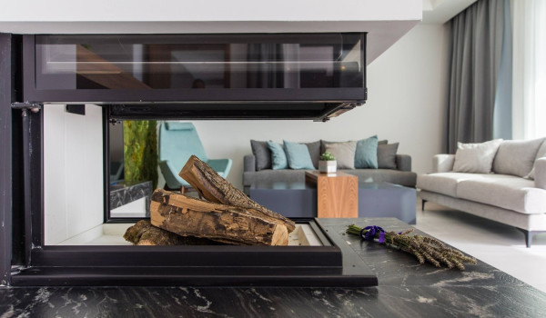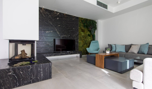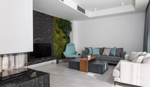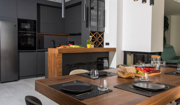 Upon entering the ground floor, you will come across a spacious living room that exudes comfort. The living room is equipped with comfortable sofas, a fireplace, and an LCD TV to relax with your favorite shows. In addition to the living room, there is a fully equipped kitchen with an island and a dining area. This part of the luxury holiday house with a sea view can be entered directly from the courtyard thanks to the sliding glass walls. On this floor, there is also a laundry room with a washing machine and dryer.