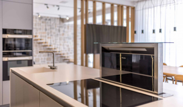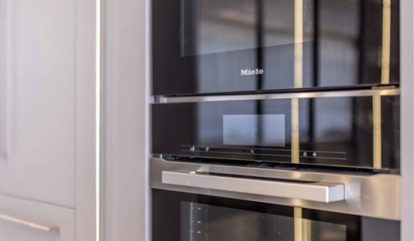 The living area is connected to a fully equipped kitchen and a dining table for 12 people. The kitchen is fully equipped and contains all the kitchen appliances: hob, extractor hood, fridge, freezer, ice maker, oven, microwave, toaster, kettle, coffee maker, wine cooler, dishwasher, blender, dishes, glasses and cutlery.