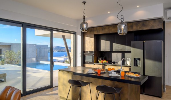 Through the glass walls you enter the air-conditioned ground floor of the villa where there is a fully equipped kitchen with island (stove, oven, hood, dishwasher, refrigerator, freezer, microwave, coffee maker, kettle, cutlery, cutlery and drinks). There is also a living table, a spacious living room with a comfortable sofa which is also a convertible double sofa, and satellite TV, and a guest toilet.