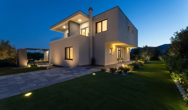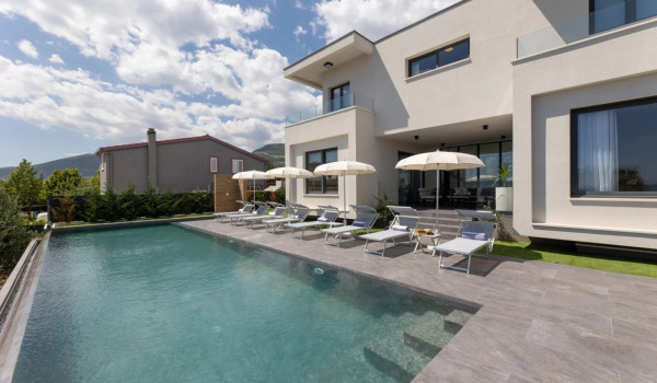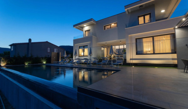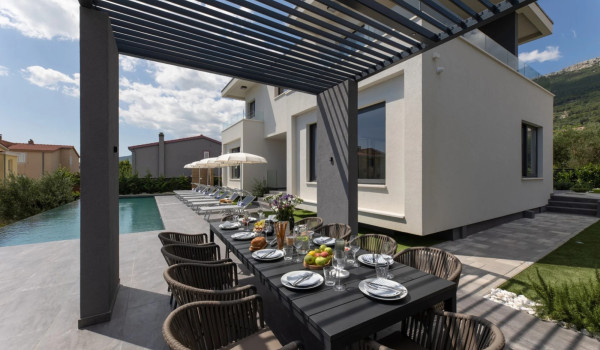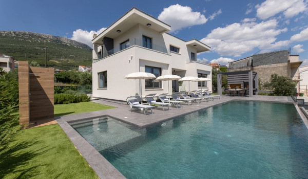 This Croatian private luxury villa "Doma" with an outdoor heated pool, sauna, and gym features a fully equipped kitchen, a living room, 5 bedrooms, 5 bathrooms, and is suitable for comfortable and luxurious accommodation for 9-10 people.