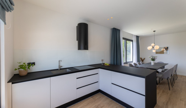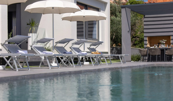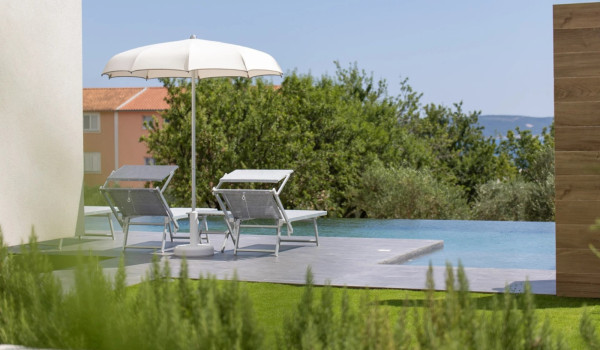 On the property of this fully fenced luxury villa, there is private parking so you can enjoy your vacation carefree. Next to the parking area, there is a separate, fenced entrance that gently introduces you to this magnificent villa with a sea view. Around the villa itself, there is a beautiful green lawn, and in front of the villa, there is a heated overflow pool (60 m2) with a counter-current swimming system and an outdoor shower, a dining area with fireplace and sink, comfortable sun loungers (8), and umbrellas (4). Inside the pool, there is also a smaller section suitable for children with a depth of 40 cm (5 m2).