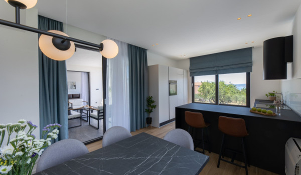 Entering the ground floor of the villa from the yard of the Dalmatian luxury villa for rent, you find yourself in a luxuriously decorated space that leads you to a modernly furnished living room equipped with a comfortable sofa, coffee table, TV, shelf, fireplace, armchair, and numerous modern details. In the other part of the ground floor, there is a fully equipped kitchen (oven, microwave, mixer, refrigerator with freezer, Nespresso coffee machine, stove, coffee capsules, dishwasher, kettle, toaster) and next to the kitchen, there is a bathroom and a bedroom.