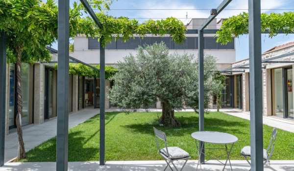 Da biste došli do naše ekskluzivne vile za 12 osoba na Braču, Bracchia Magic Retreat II, slijedite lijevu stazu popločanu kamenom koji završava ulazom u vilu, a s čije desne strane se nalazi povrtnjak. Suvremena održiva vila za najam na Braču Bracchia Magic Retreat II izgrađena je oko umirujućeg klaustora - unutarnjeg dvorišta sa stoljetnim stablom masline u njegovu središtu, ograđenog staklenim stjenkama koji pruža obilje prirodne svjetlosti cijelom prizemlju. Počevši od glavnog ulaza i krećući se prirodnom putanjom oko klaustora, redom nailazimo na: radnu sobu s prijenosnim računalom, pisačem i udobnom foteljom, 2 potpuno opremljene kuhinje, blagovaonicu sa stolom za 12 osoba, dnevni boravak, knjižnicu/ medijsku sobu i dvije "suite" jedinice koje se sastoje od sobe s vlastitom kupaonicom i dnevnog boravka s velikim SMART TV-om, svaka od njih ima pristup sunčanoj terasi i privatnom kutku za odmor s vrtnim namještajem.