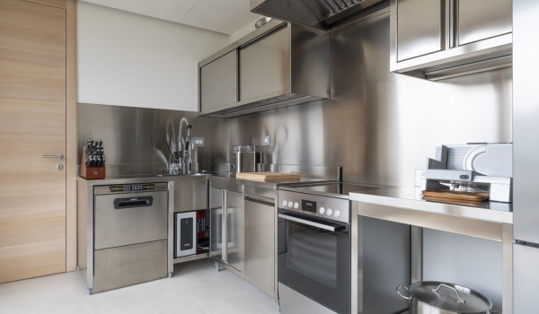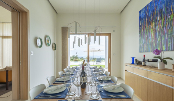 Potpuno opremljena prostrana profesionalna kuhinja povezana je s glavnom kuhinjom s neformalnim blagovaonskim prostorom, koja ima izlaz na terasu s potpuno opremljenom ljetnom kuhinjom i terasom bazena s nekoliko zona za opuštanje koje pružaju pogled na more i vrt. Prozračna blagovaonica s suvremenim umjetničkim djelima i zanimljivim lusterom slijedi kuhinju i nastavlja se na salon/ dnevni boravak s udobnim namještajem, TV-om i modernim unutarnjim kaminom koji je također dio unutrašnjosti posljednje prostorije u prizemlju koja gleda na terasu uz bazen, a služi kao medijska soba/ kućna biblioteka. Sa stražnje strane okrenut unutarnjem dvorištu, smješten je prostrani atrij s WCom, modernim stubištem, stolom za stolni nogomet i dizalom, cijelo područje je prozračno obasjano zrakama sunca, te ukrašeno pažljivo odabranim djelima velike umjetničke vrijednosti.