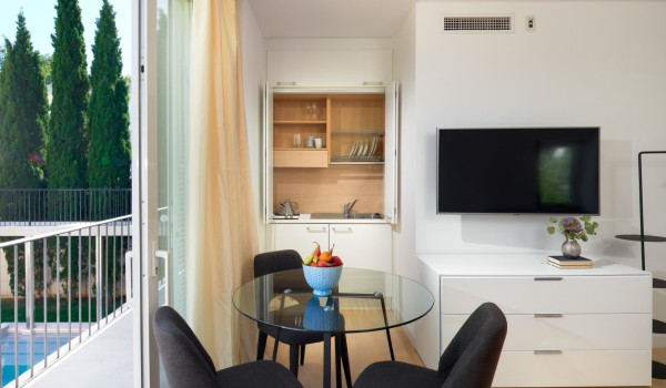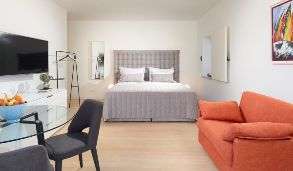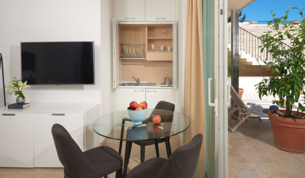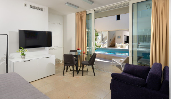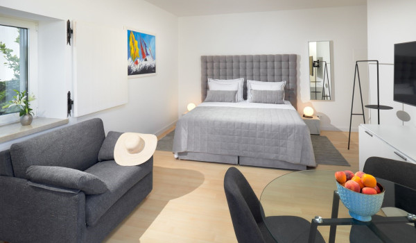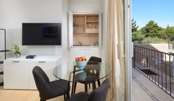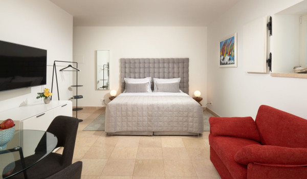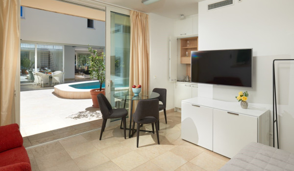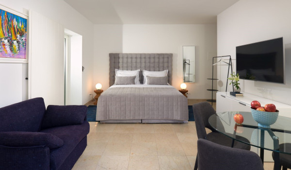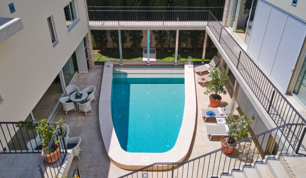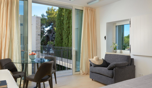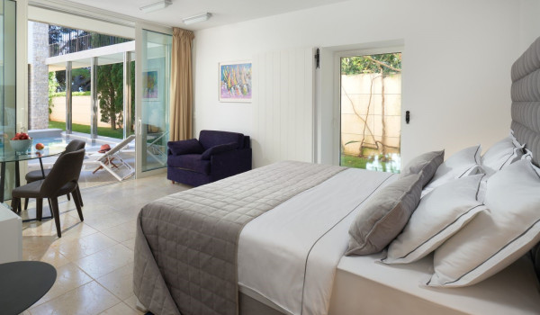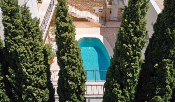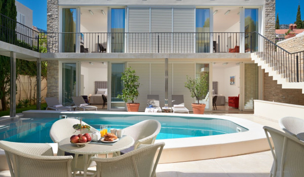 Druga stambena jedinica ove jedinstvene luksuzne vile uz more također se dijeli na dva kata, odnosno na prizemlje i prvi kat. Na svakom katu su po dva apartmana, od kojih svaki ima bračni krevet, kupaonicu, manju kuhinju i garderobu. Oba su dijela luksuzne vile za odmor tik uz more u Bolu međusobno povezani zajedničkim dvorištem, u čijem je centralnom dijelu smješten privatni grijani bazen (4×6m). U sklopu pažljivo održavane i kreativno osmišljene okućnice smjestila se i velika terasa opremljena velikim drvenim stolom s prelijepim pogledom na more. Ovaj bajkoviti kutak je carstvo „debele“ hladovine ove vile za odmor na plaži s pogledom na more i tokom najvrućih ljetnih dana je pravi mali raj za gurmane, zahvaljujući vanjskom roštilju - neophodnom dodatku svake kvalitetne dalmatinske kuće.
