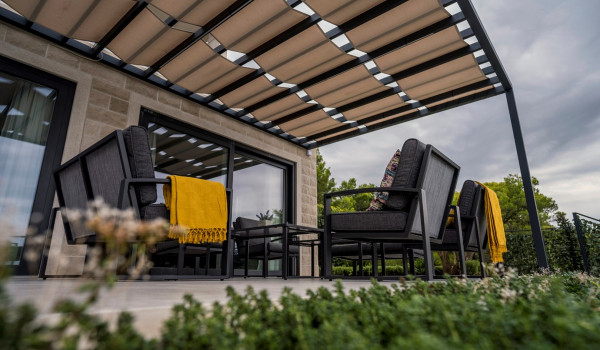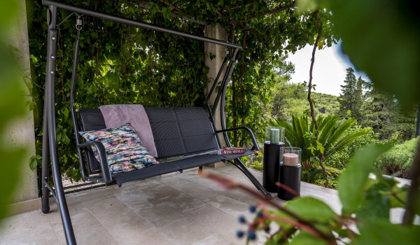 Posebnost ove vile za najam Diletta Postira su njene kaskadne pažljivo uređene terase. Na prvoj terasi koja je povezana s prizemnim dijelom vile se plinski roštilj, natkriveni blagovaonski stol za 12 osoba te vanjska garnitura za sjedenje. Na drugoj terasi se nalazi prostrani grijani bazen pored kojeg se nalazi 8 udobnih ležaljki za sunčanje te vanjski tuš. Posljednja, treća terasa je livada na kojoj možete ispijati šalicu vaše prve kave i uživati u prekrasnim prizorima Jadranskog mora i susjednog Splita. Ovdje se nalazi sauna i teretana za sve one koje žele ostati aktivni za vrijeme svog odmora. Sve terase se povezane bočnim kamenim stepenicama ograđene staklenom ogradom.