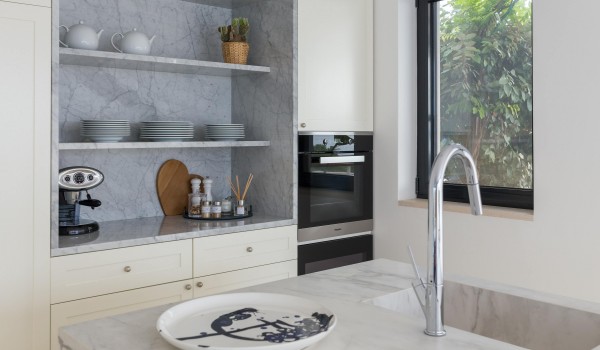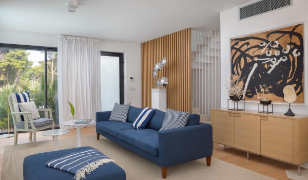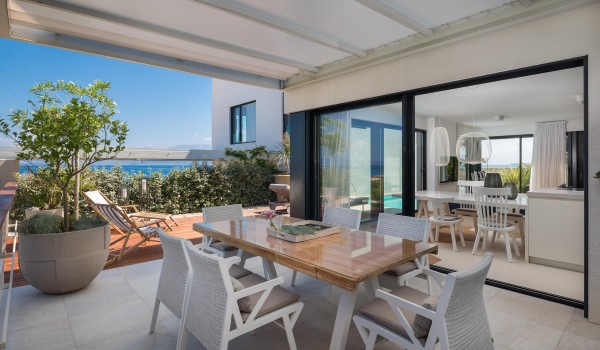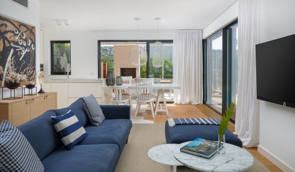 Velika staklena klizna vrata povezuju vanjsku terasu s interijerom prizemlja vile na Braču prvi red do mora. U prizemlju se nalazi moderan dnevni boravak s kaučem i SMART TV-om, blagovaonica sa stolom i stolicama, potpuno opremljena moderna kuhinja s Miele aparatima, hladnjak za vino i gostinjski wc koji se također nalazi u prizemlju.