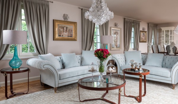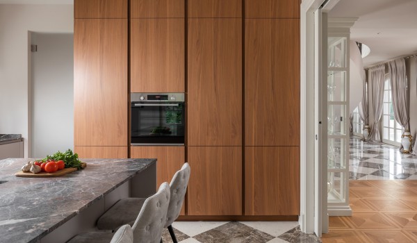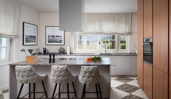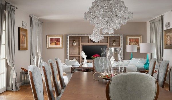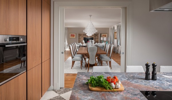 Desna strana predvorja vodi u blagovaonu i dnevni boravak povezane u jednu prostoriju i kuhinju odvojenu kliznim vratima koje krase slike slavnih slikara i kristalni lusteri. U ovoj raskošnoj modernoj kuhinji nalazi se i otok s barskim stolicama. Opremljena je svim potrebnim kuhinjskim priborom i uređajima. U blagovaoni u nastavku se udobno može smjestiti 10 ljudi i zajedno uživati u ukusnim obrocima. Profinjeni dnevni boravak opremljen je s dvije velike svijetlo plave udobne sofe i velikim LCD TV-om. U vrt se može izaći kroz dnevni boravak i predvorje, a u prizemlju se također nalazi gostinjski toalet.