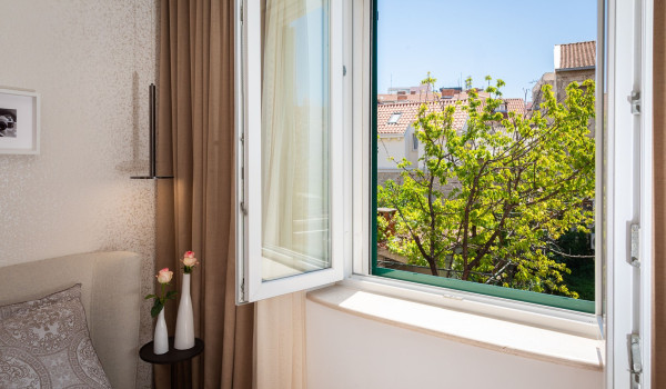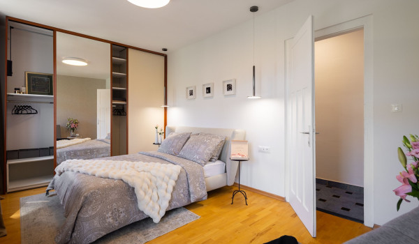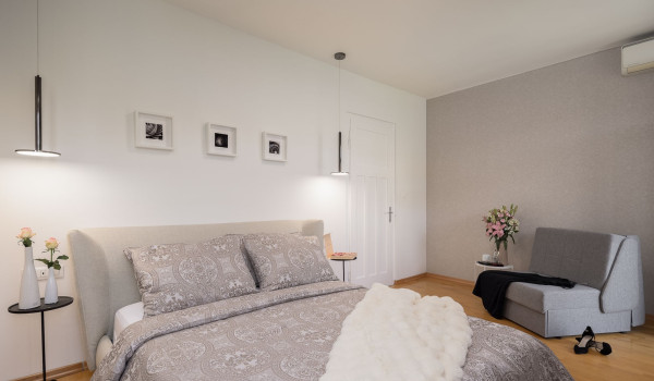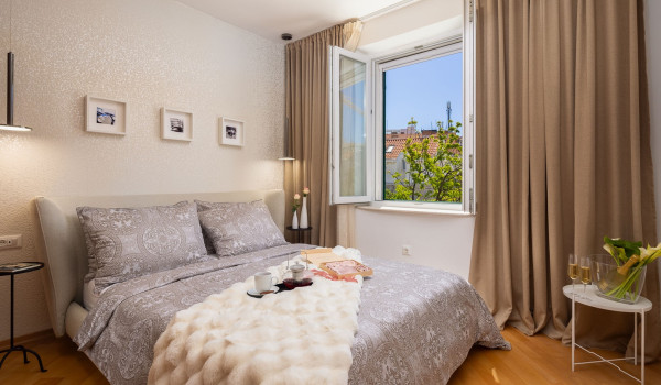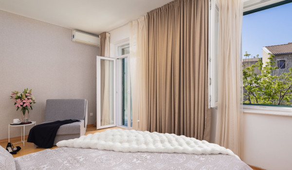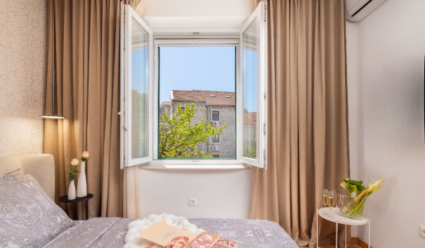 Ulaskom u ovaj luksuzni splitski apartman Luft u centru grada Splita, ono što vam oduzima dah je prostranost apartmana. Pri samom ulazu u ovaj moderno uređeni apartman, nalazite se u dugom hodniku iz kojeg možete pristupiti dvjema spavaćim sobama (25 m2 i 17 m2) s desne strane, u kojima se nalazi komforni king-size krevet, visoki ormar, noćni ormarići. Jedna od dvije spavaće sobe ima privatan izlaz na balkon koji gleda na raskošno uređeni zeleni vrt kojeg krase mnogobrojne vrste cvijeća i biljki, dok druga spavaća soba ima pogled na potpuno ograđeni vrt.