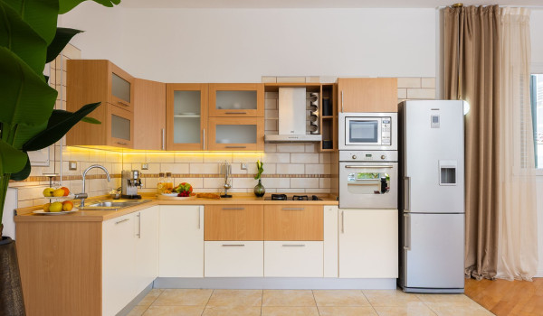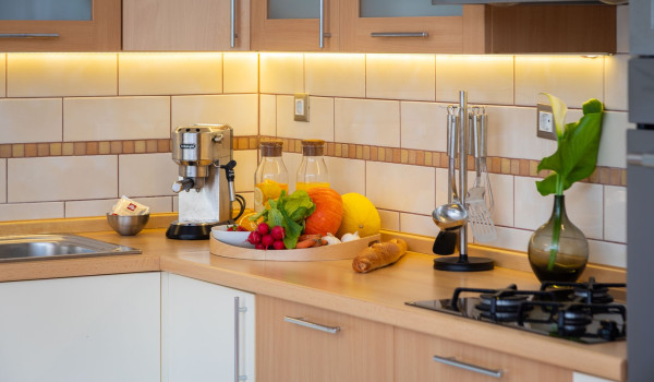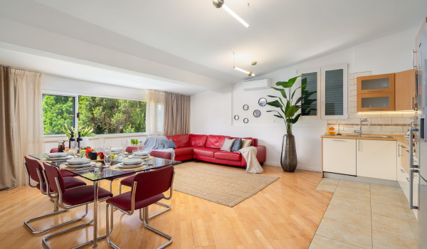 Hodajući prema naprijed, dolazite do malenog kutka za sjedenje kojeg krasi luksuzna, moderna fotelja koja vam jamči potpun odmor uz umirujući pogled prema zelenoj oazi. Pored kutka za sjedenje, nalazi se ulaz koji vas uvodi u prostrani, prirodno osvijetljeni dnevni boravak (40 m2) u čijem prostoru se također smjestila i potpuno opremljena kuhinja. Kuhinja je opremljena aparatom za kavu (DeLonghi), napom, kuhalom za vodu, pećnicom, mikrovalnom pećnicom, štednjakom, hladnjakom. Pored potpuno opremljene kuhinje, nalazi se udobna kožna kutna garnitura koju dodatno naglašava mekani tepih koji se nalazi ispred nje.