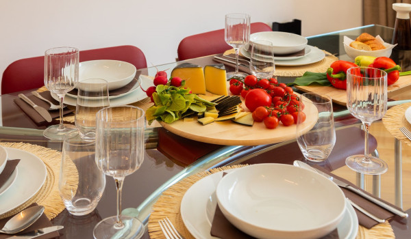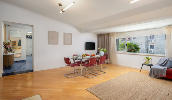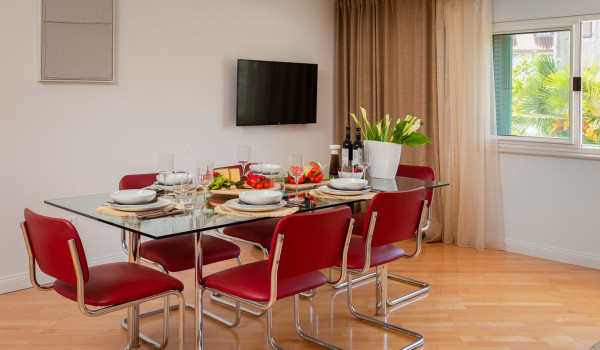 U sklopu dnevnog boravka, smjestio se i blagovaonski stol s udobnim kožnim stolicama koje se savršeno uklapaju uz udobnu sofu, LCD TV te klizna stijenka koja omogućava dodatnu prozračnost i svjetlost unutar ovog luksuznog splitskog apartmana za najam.