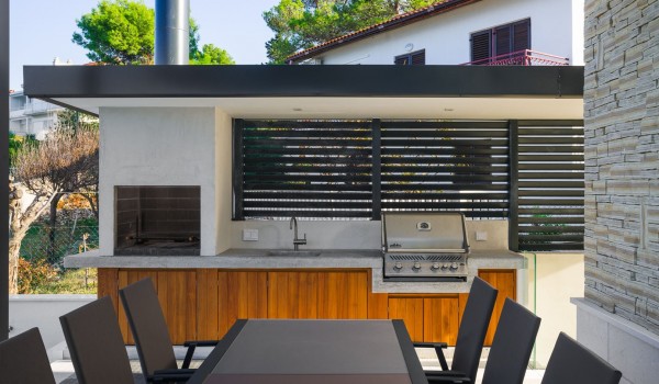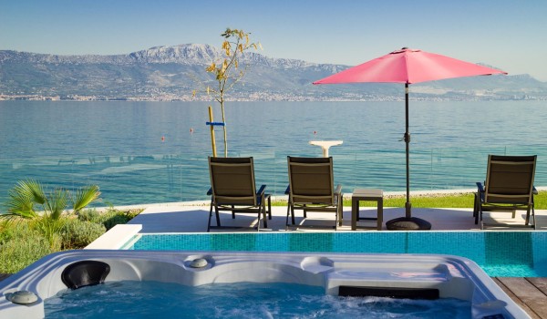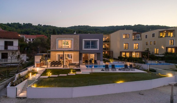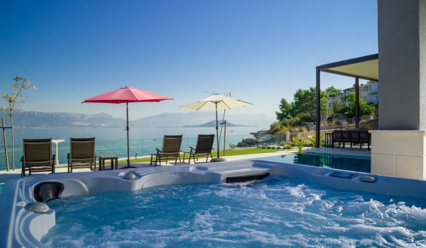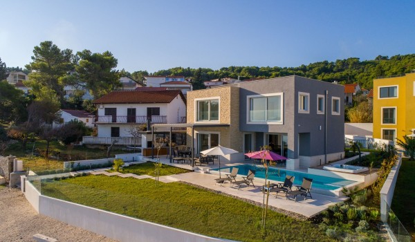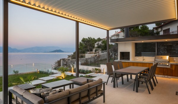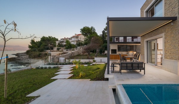 Vila za odmor smještena je uz plažu i nudi idiličan pogled na mirnu uvalu Jadranskog mora sa zelenim brežuljcima u pozadini. Na terasi gosti mogu uživati u prostranom grijanom bazenu (39 m2), jacuzziju i vanjskom tušu te se opustiti na ležaljkama ili udobnim sjedalima. Za uživanje u dalmatinskim specijalitetima u dvorištu se nalazi ljetna kuhinja s kaminom na drva i električnim roštiljem te stolom za blagovanje za 8 osoba.
