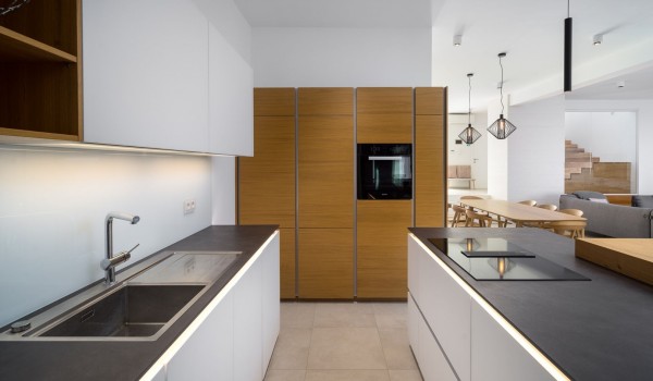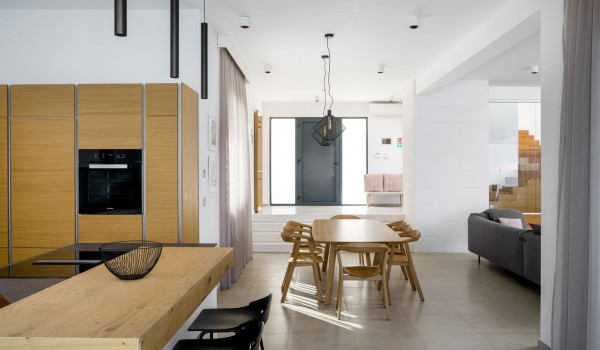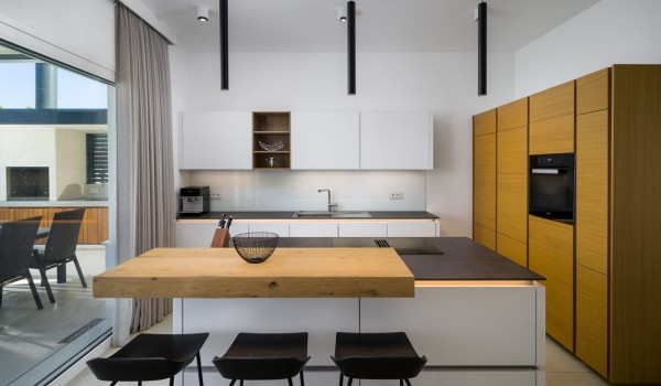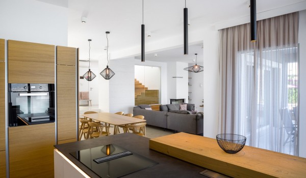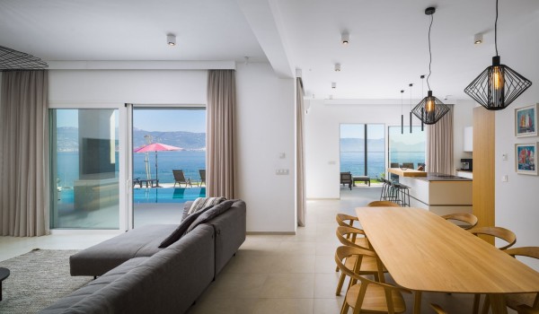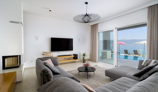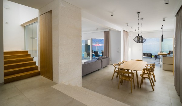 Potpuno opremljena kuhinja sa stolom za 8 osoba i udoban dnevni boravak sa sofama, LCD TV-om i kaminom s velikim staklenim stijenama otvorenim prema dvorištu. Moderni interijeri kuća za odmor i spektakularni pogled na azurno Jadransko more koji se pruža iz vile zadovoljit će i najzahtjevnije goste. Na ovoj etaži se nalazi dodatna prostorija opremljena čajnom kuhinjom, stolom, namještajem i izlazom na vanjsku terasu.