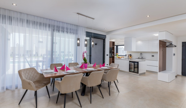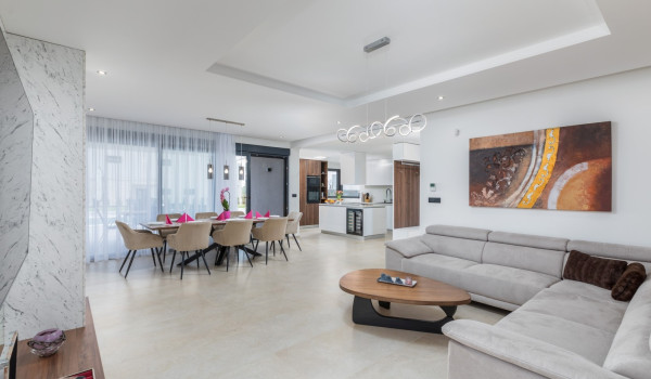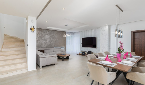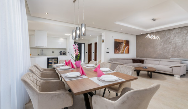 S terase se ulazi u otvoreni prostor prizemlja kuće za odmor u kojem se nalazi prostrani dnevni boravak s velikom udobnom sofom i LCD Tvom, PS 5 konzolom te potpuno opremljena kuhinja i blagovaonica sa stolom za objedovanje za 8 osoba. Ovaj pažljivo uređeni moderni prostor odiše toplinom i udobnošću. Prostrana kuhinja ove luksuzne vile za najam i odmor opremljena je svim modernim aparatima štednjakom, pećnicom, hladnjakom s zamrzivačem, perilicom posuđa, kuhalom za vodu, aparatom za kavu, hladnjakom za vino, ledomatom i tosterom. U prizemlju se također nalazi prostrana klimatizirana spavaća soba sa LCD-Tvom, king-size krevetom i en suite kupaonom s tušem te gostinski toalet.