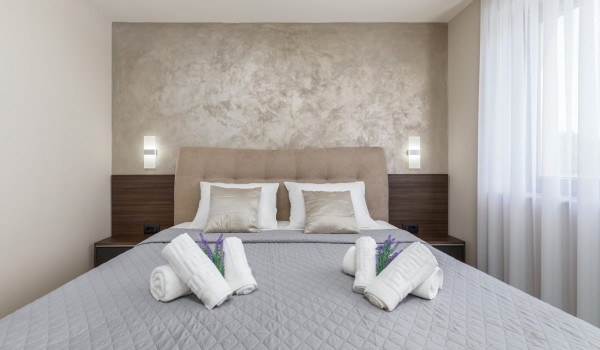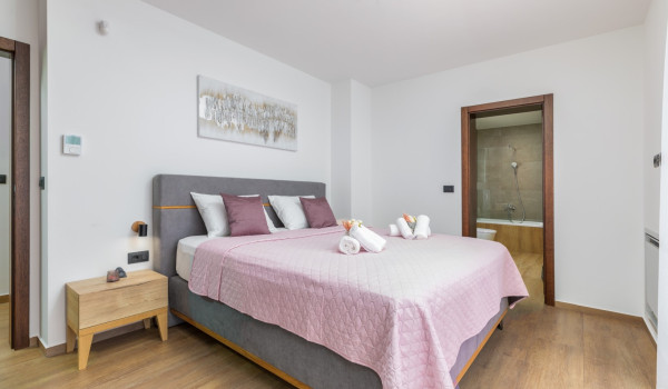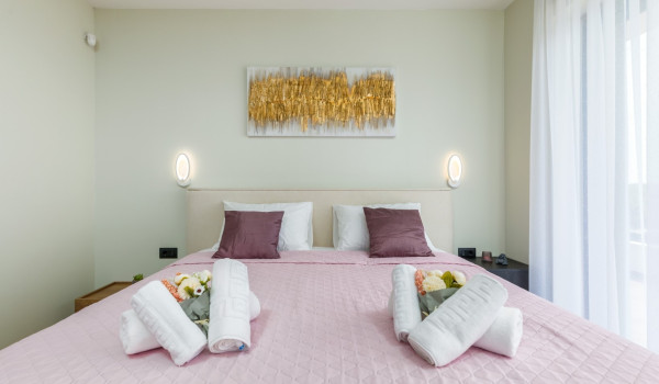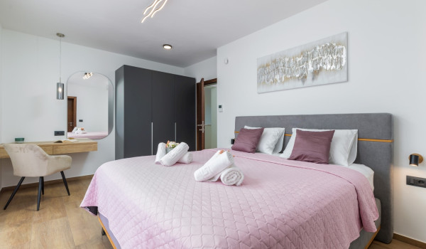 Stepenicama dolazimo na prvi kat hrvatske luksuzne obiteljske vile za najam gdje su se rasporedile 3 spavaće sobe. Sve sobe imaju king-size krevete i en-suite kupaonicu s tušem, LCD Tv i centralno grijanje. Luksuzna vila Splendour Skicini-Pula ima prostranu terasu s lounge garniturom s koje se pruža prekrasan pogled.