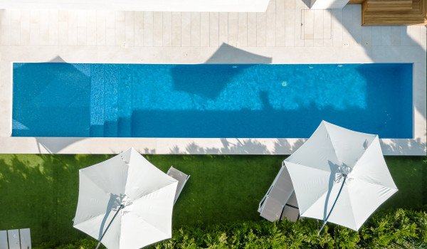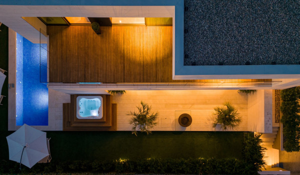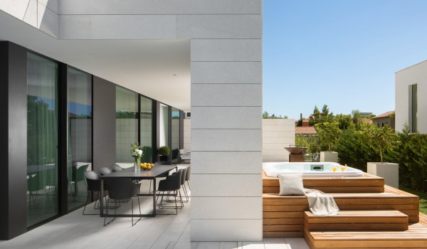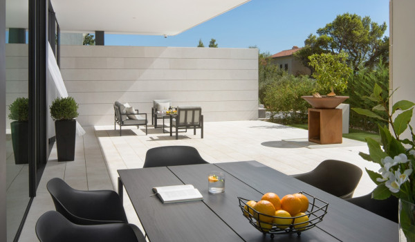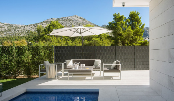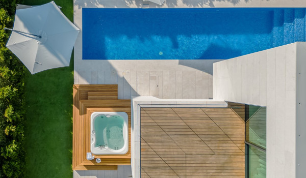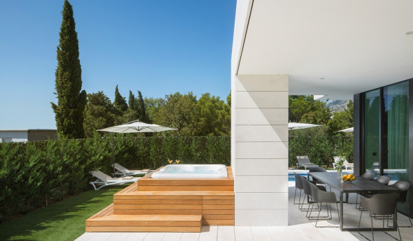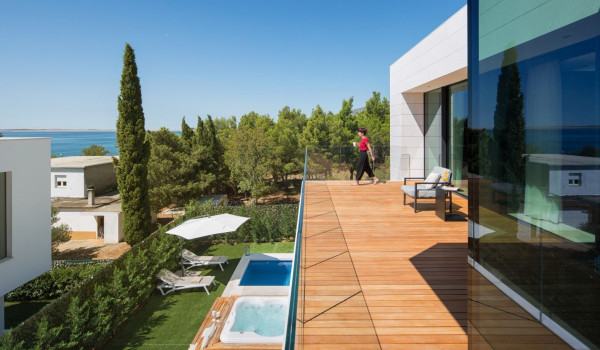 Središnji dio luksuzne vile za obiteljski odmor Calmissima, smješten u prizemlju, zauzima očaravajuća vanjska terasa s privatnim bazenom od 39m2 (13m x 3m x 1,35 m) koji ima sustav grijanja te vanjski tuš. Na ovoj predivnoj terasi dok se opuštate na ležaljkama uz bazen možete uživati u pogledu na Nacionalni park Paklenicu ili pak uživati u jacuzziju koji se nalazi pokraj bazena. Pokraj vanjskog natkrivenog stola za objedovanje za 8 osoba nalazi se i vanjski dnevni prostor modernog dizajna za uživanje u toplim ljetnim noćima.