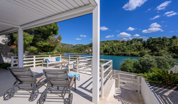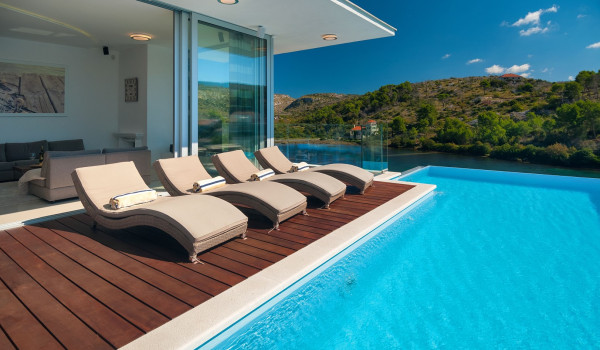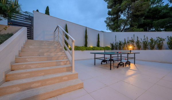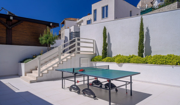 Рядом с главным входом на эту виллу с подогреваемым бассейном, рсположенным на верхнем этаже, находится открытая площадка с развлекательной зоной с настольным теннисом и дартсом. При входе в интерьер второго этажа этого дома для отдыха открывается обширное пространство с гармонично объединенёнными кухней, столовой и гостиной. Кроме удобного дивана, жилая зона располагает спутниковым телевидением и DVD, а большая стеклянная стена соединяет её с открытым подогреваемым бассейном (20 м²), рядом с ним расположены удобные шезлонги для отдыха и солнечных ванн. С этого этажа открывается чудесный вид на уединённость и красоту самой бухты, а также на близлежащий посёлок и игривые морские волны.