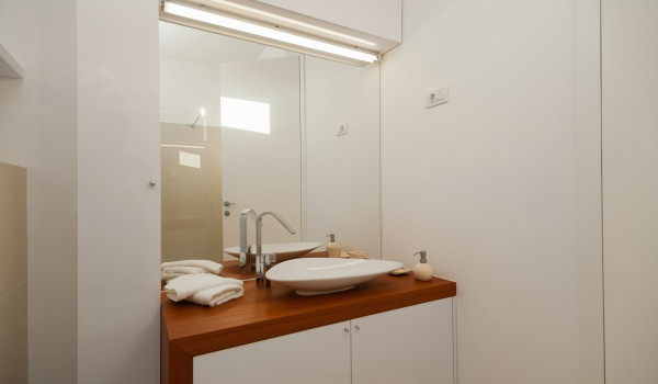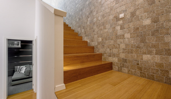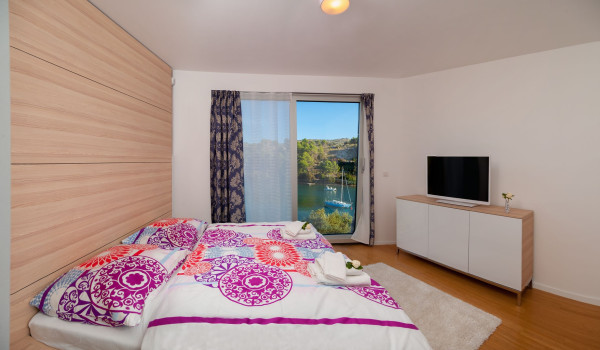 Внутренняя деревянная лестница этой виллы для отдыха на Браче спускается прямо из столовой на первый этаж с полуэтажом. Здесь, на первом этаже находятся 2 комфортабельные двухместные спальни со своими ванными комнатами с душем и видом на море. Рядом с ними, на том же этаже, расположен красивый телевизионный зал, полностью звукоизолированный и идеально подходящий для отдыха и релаксации. На полуэтаже находится ещё одна двухместная спальня с собственной душевой и собственной террасой, дополнительно украшенной деревянной мебелью. Из этой спальни также открывается вид на море. Также на этом этаже расположены кладовая и прачечная.