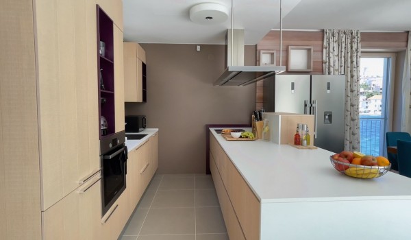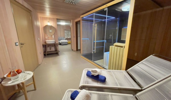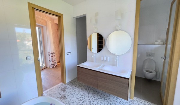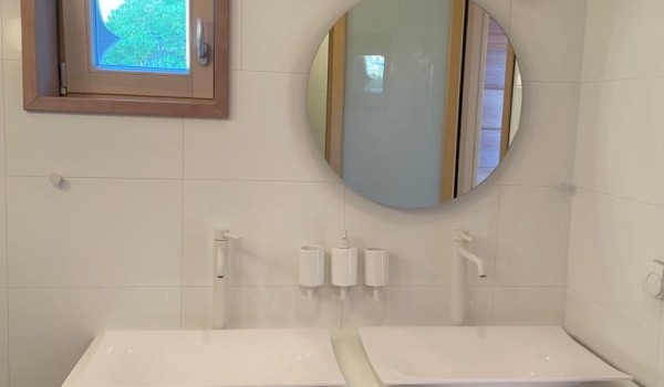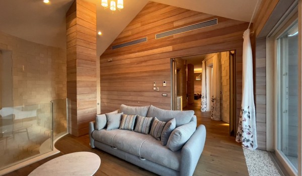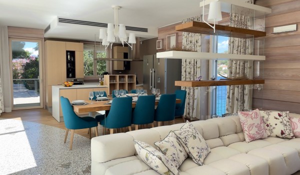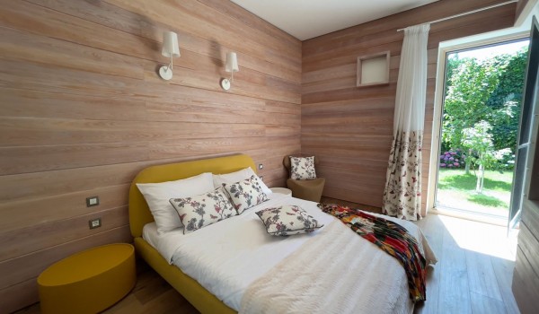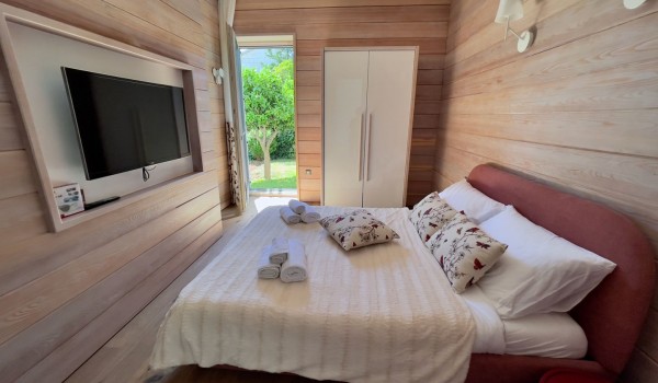 Через главный вход виллы с сауной вы попадаете в просторную гостиную, украшенную дизайнерской мебелью и тщательно, профессионально подобранными деталями . Раздвижные стены обеспечивают проникновение естественного света и его гармонию с интерьером, а также прямой выход из гостиной во двор. В этой части также находится новая, современная, полностью оснащённая кухня с обеденной зоной для незабываемого общения с близкими. На цокольном этаже также есть две просторные спальни с двуспальными кроватями и примыкающими ванными комнатами с душем, украшенными красивой мозаикой в форме бабочки.