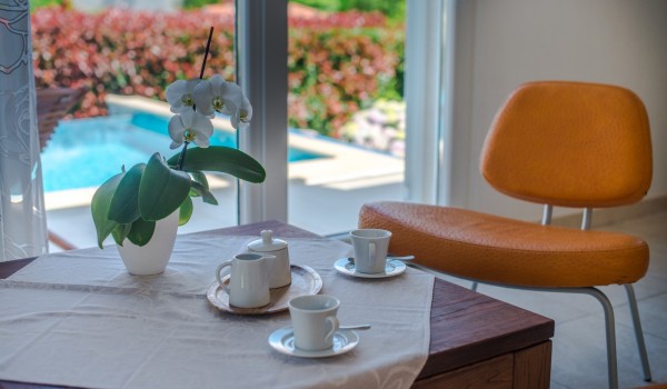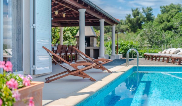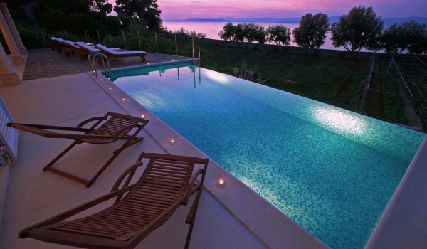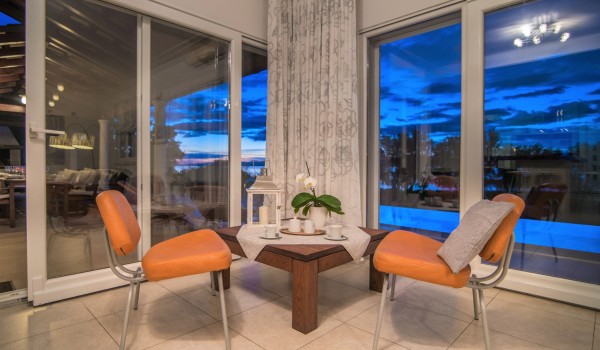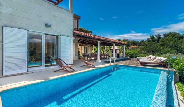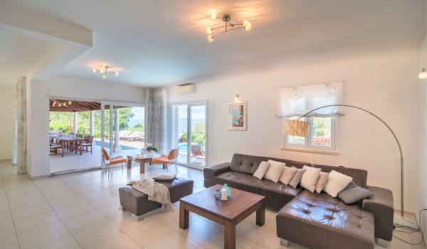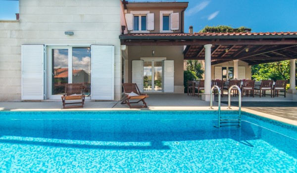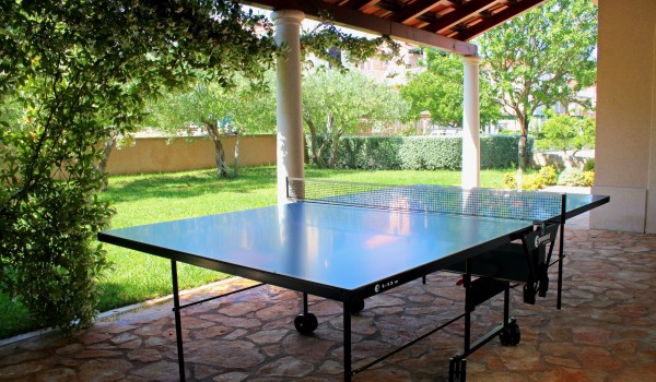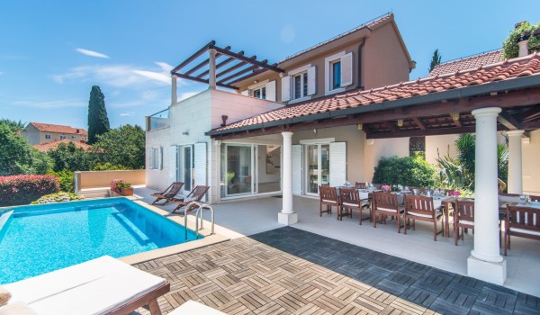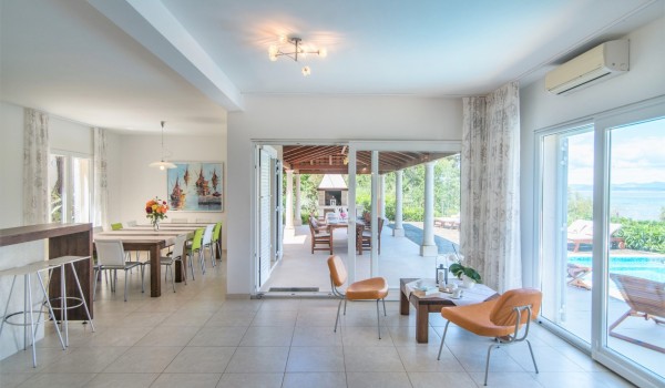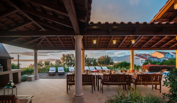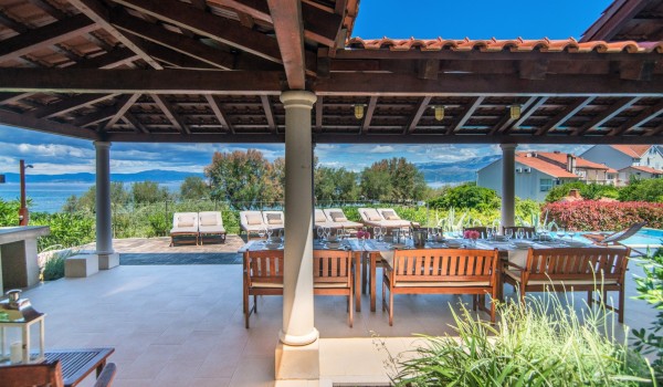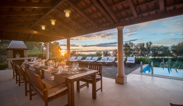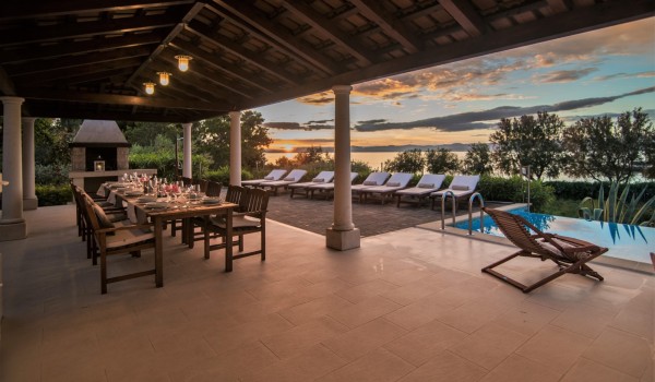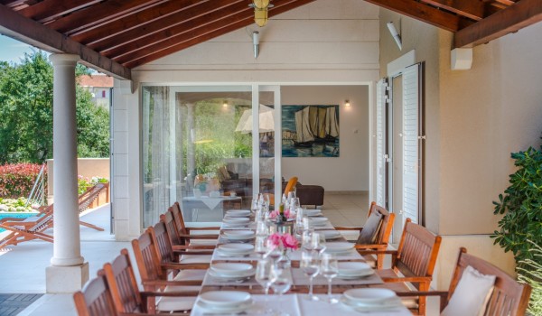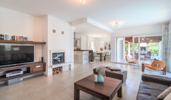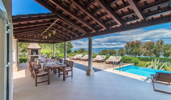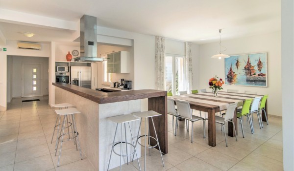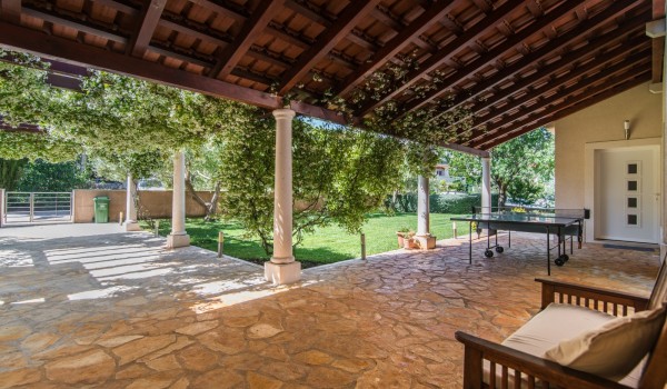 Компактный и гармоничный дизайн отражает связь всех частей через великолепную веранду с многочисленными каменными колоннами, создающую так необходимую тень и приятное место для отдыха. С этой веранды открывается прекрасный панорамный вид на море, а еще она располагает большим столом на 12 человек. Сияющей жемчужиной этой прекрасной виллы безусловно является великолепный пейзажный бассейн с подогревом, окружённый шезлонгами.