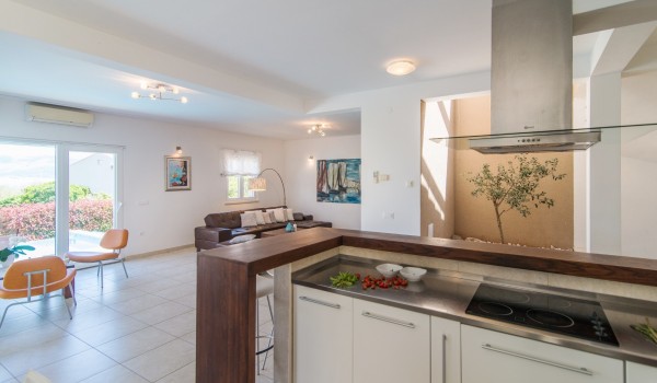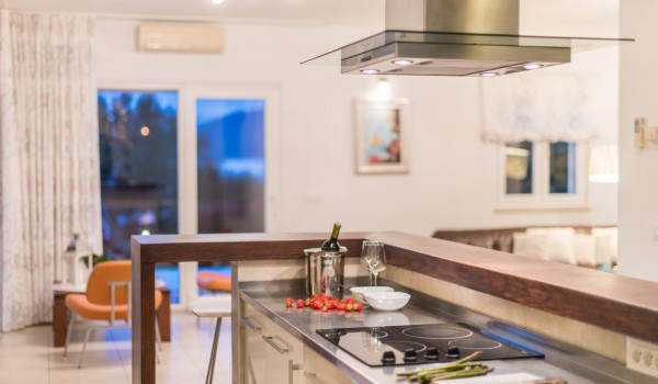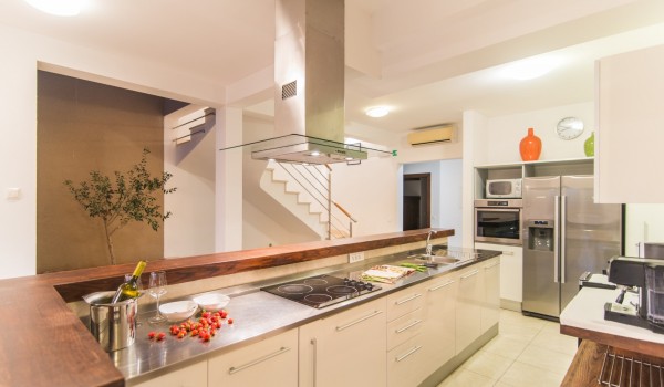 На первом этаже главной части виллы Mediterranean находится просторная, уютная гостиная роскошного дизайна. В этой части гармонично сочетаются полностью оснащённая современная кухня с барной стойкой, просторная столовая и большая гостиная с телевизором и камином.
