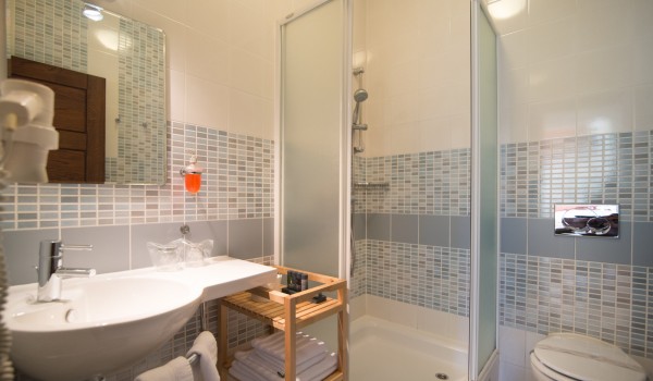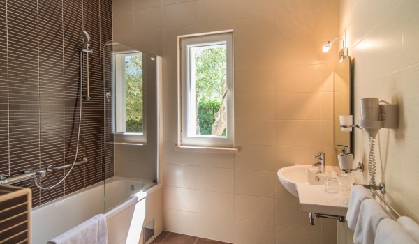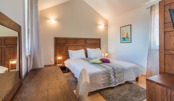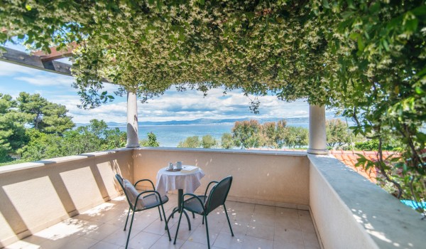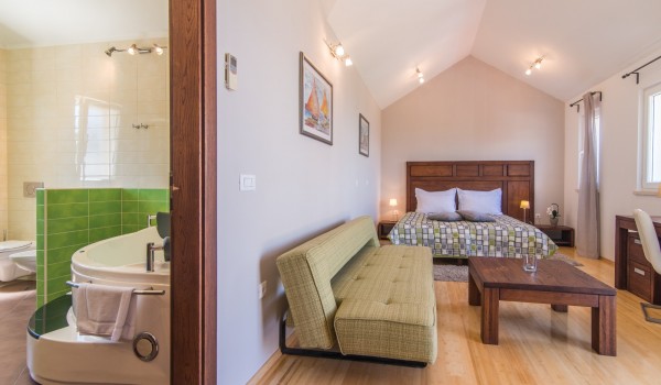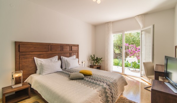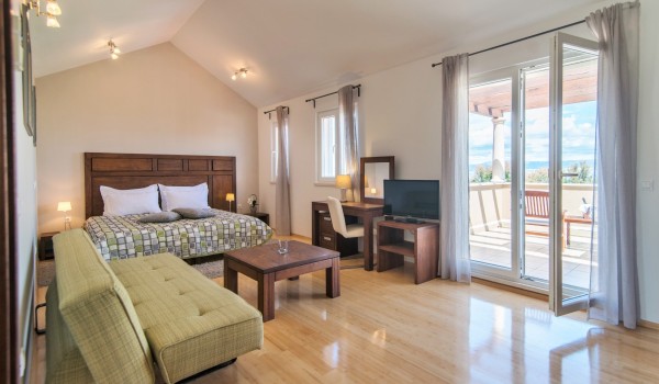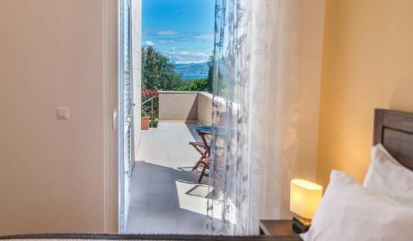 На втором этаже гостевой части пристройки находится двухместная спальня с двуспальной кроватью, террасой с мебелью и видом на море, а также собственная ванная комната.